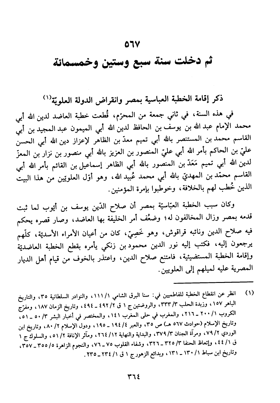 فِي هَذِهِ السَّنَةِ، فِي ثَانِي جُمُعَةٍ مِنَ الْمُحَرَّمِ، قُطِعَتْ خُطْبَةُ الْعَاضِدِ لِدِينِ اللَّهِ أَبِي مُحَمَّدٍ الْإِمَامِ عَبْدِ اللَّهِ بْنِ يُوسُفَ بْنِ الْحَافِظِ لِدِينِ اللَّهِ أَبِي الْمَيْمُونِ عَبْدِ الْمَجِيدِ بْنِ أَبِي الْقَاسِمِ مُحَمَّدِ بْنِ الْمُسْتَنْصِرِ بِاللَّهِ أَبِي تَمِيمٍ مَعْدِ بْنِ الظَّاهِرِ لِإِعْزَازِ دِينِ اللَّهِ أَبِي الْحَسَنِ عَلِيِّ بْنِ الْحَاكِمِ بِأَمْرِ اللَّهِ أَبِي عَلِيٍّ الْمَنْصُورِ بْنِ الْعَزِيزِ بِاللَّهِ أَبِي مَنْصُورِ بْنِ نِزَارِ بْنِ الْمُعِزِّ لِدِينِ اللَّهِ أَبِي تَمِيمٍ مَعْدِ بْنِ الْمَنْصُورِ بِاللَّهِ أَبِي الظَّاهِرِ إِسْمَاعِيلَ بْنِ الْقَائِمِ بِأَمْرِ اللَّهِ أَبِي الْقَاسِمِ مُحَمَّدِ بْنِ الْمَهْدِيِّ بِاللَّهِ أَبِي مُحَمَّدٍ عُبَيْدِ اللَّهِ، وَهُوَ أَوَّلُ الْعَلَوِيِّينَ مِنْ هَذَا الْبَيْتِ الَّذِينَ خُطِبَ لَهُمْ بِالْخِلَافَةِ، وَخُوطِبُوا بِإِمْرَةِ الْمُؤْمِنِينَ.