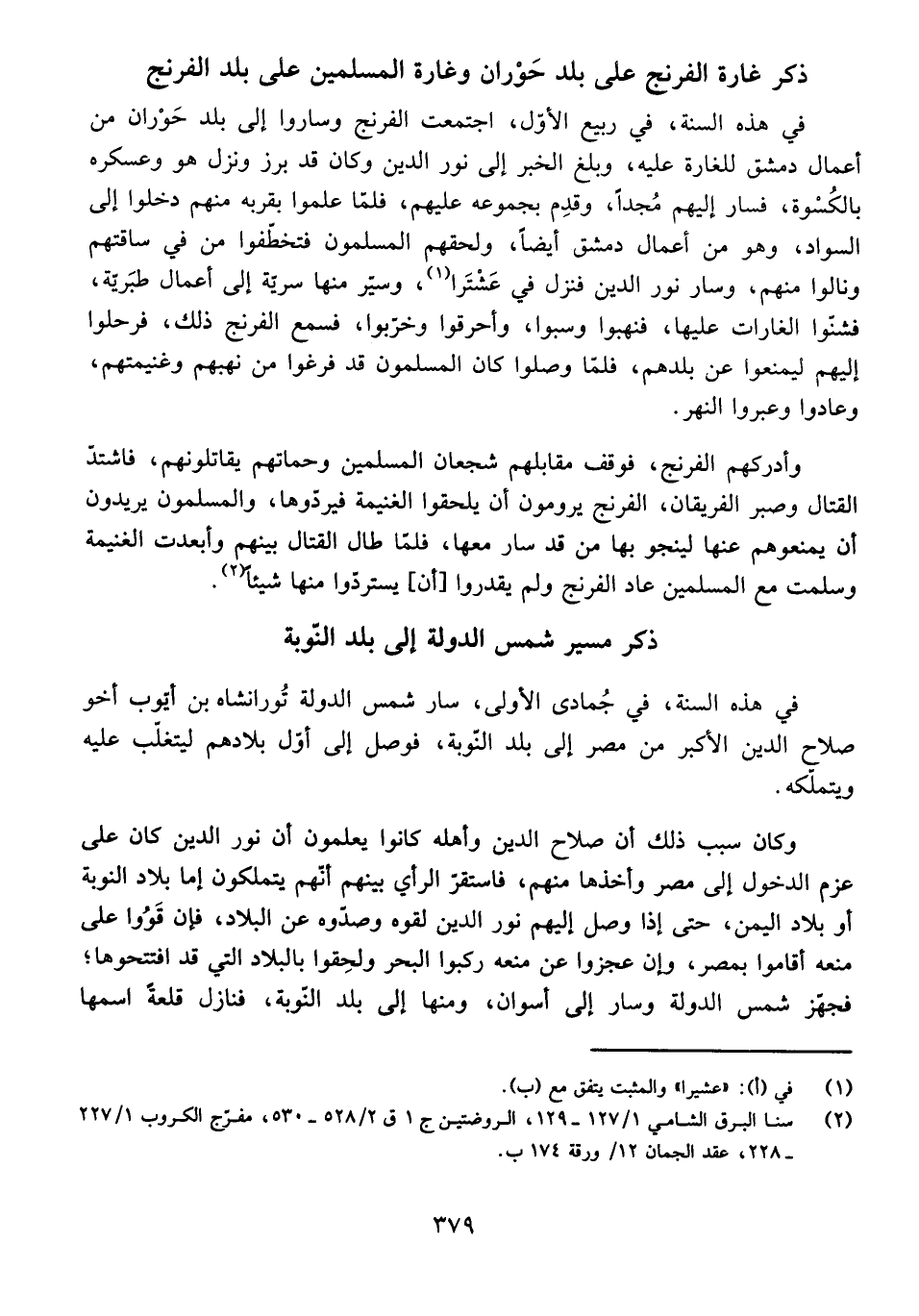 فِي هَذِهِ السَّنَةِ، فِي جُمَادَى الْأُولَى، سَارَ شَمْسُ الدَّوْلَةِ تُورَان شَاهْ بْنُ أَيُّوبَ أَخُو صَلَاحِ الدِّينِ الْأَكْبَرِ مِنْ مِصْرَ إِلَى بَلَدِ النُّوبَةِ، فَوَصَلَ إِلَى أَوَّلِ بِلَادِهِمْ ; لِيَتَغَلَّبَ عَلَيْهِ وَيَتَمَلَّكَهُ.