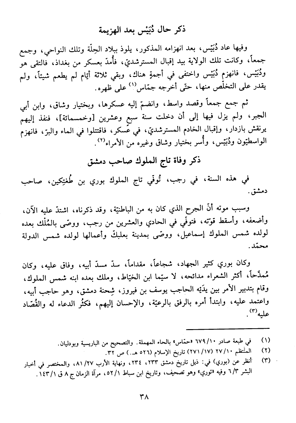 فِي هَذِهِ السَّنَةِ فِي رَجَبٍ، تُوُفِّيَ تَاجُ الْمُلُوكِ بُورِي بْنُ طُغْتِكِينَ، صَاحِبُ دِمَشْقَ، وَسَبَبُ مَوْتِهِ أَنَّ الْجُرْحَ الَّذِي كَانَ بِهِ مِنَ الْبَاطِنِيَّةِ - وَقَدْ ذَكَرْنَاهُ - اشْتَدَّ عَلَيْهِ الْآنَ وَأَضْعَفَهُ، وَأَسْقَطَ قُوَّتَهُ، فَتُوُفِّيَ فِي الْحَادِي وَالْعِشْرِينَ مِنْ رَجَبٍ، وَوَصَّى بِالْمُلْكِ بَعْدَهُ لِوَلَدِهِ شَمْسِ الْمُلُوكِ إِسْمَاعِيلَ، وَوَصَّى بِمَدِينَةِ بَعْلَبَكَّ وَأَعْمَالِهَا لِوَلَدِهِ شَمْسِ الدَّوْلَةِ مُحَمَّدٍ.