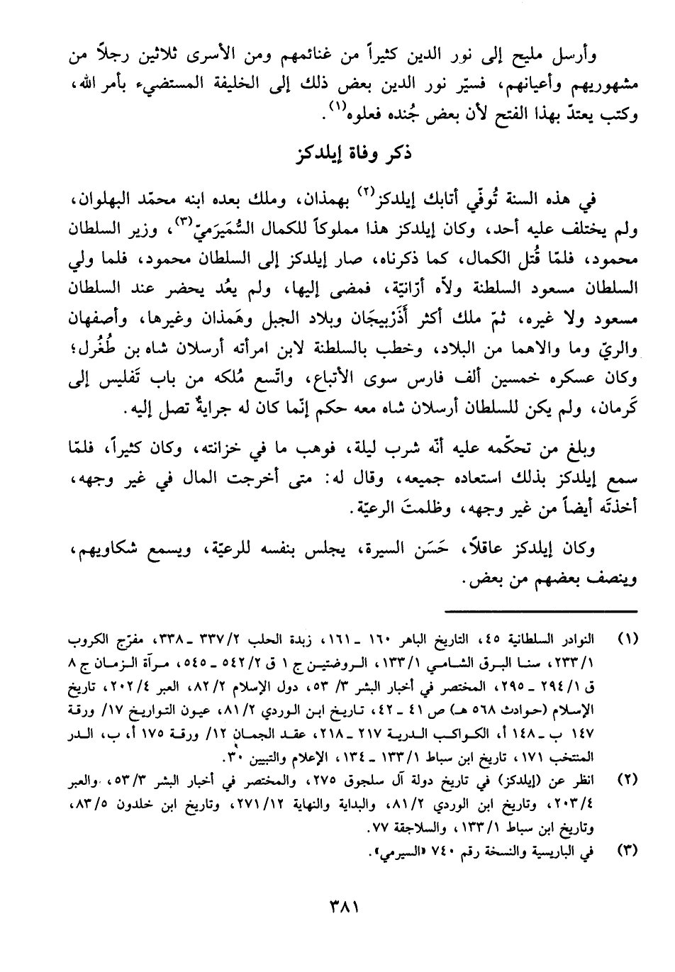 فِي هَذِهِ السَّنَةِ تُوُفِّيَ أَتَابِكُ إِيلْدِكْزُ بِهَمَذَانَ، وَمَلَكَ بَعْدَهُ ابْنُهُ مُحَمَّدٌ الْبَهْلَوَانُ، وَلَمْ يَخْتَلِفْ عَلَيْهِ أَحَدٌ، وَكَانَ إِيلْدِكْزُ هَذَا مَمْلُوكًا لِلْكَمَالِ السُّمَيْرَمِيِّ، وَزِيرِ السُّلْطَانِ مَحْمُودٍ، فَلَمَّا قُتِلَ الْكَمَالُ، كَمَا ذَكَرْنَاهُ، صَارَ إِيلْدِكْزُ إِلَى السُّلْطَانِ مَحْمُودٍ، فَلَمَّا وَلِيَ السُّلْطَانُ مَسْعُودٌ السَّلْطَنَةَ وَلَّاهُ أَرَّانِيَّةَ، فَمَضَى إِلَيْهَا، وَلَمْ يَعُدْ يَحْضُرُ عِنْدَ السُّلْطَانِ مَسْعُودٍ وَلَا غَيْرِهِ، ثُمَّ مَلَكَ أَكْثَرَ أَذْرَبِيجَانَ وَبِلَادَ الْجَبَلِ وَهَمَذَانَ وَغَيْرَهَا، وَأَصْفَهَانَ وَالرَّيَّ وَمَا وَالَاهُمَا مِنَ الْبِلَادِ، وَخَطَبَ بِالسَّلْطَنَةِ لِابْنِ امْرَأَتِهِ أَرْسِلَان شَاهْ بْنِ طُغْرُلَ، وَكَانَ عَسْكَرُهُ خَمْسِينَ أَلْفِ فَارِسٍ سِوَى الْأَتْبَاعِ، وَاتَّسَعَ مُلْكُهُ مِنْ بَابِ تَفْلِيسَ إِلَى كَرْمَانَ، وَلَمْ يَكُنْ لِلسُّلْطَانِ أَرْسِلَان شَاهْ مَعَهُ حُكْمٌ إِنَّمَا كَانَ لَهُ جِرَايَةً تَصِلُ إِلَيْهِ.