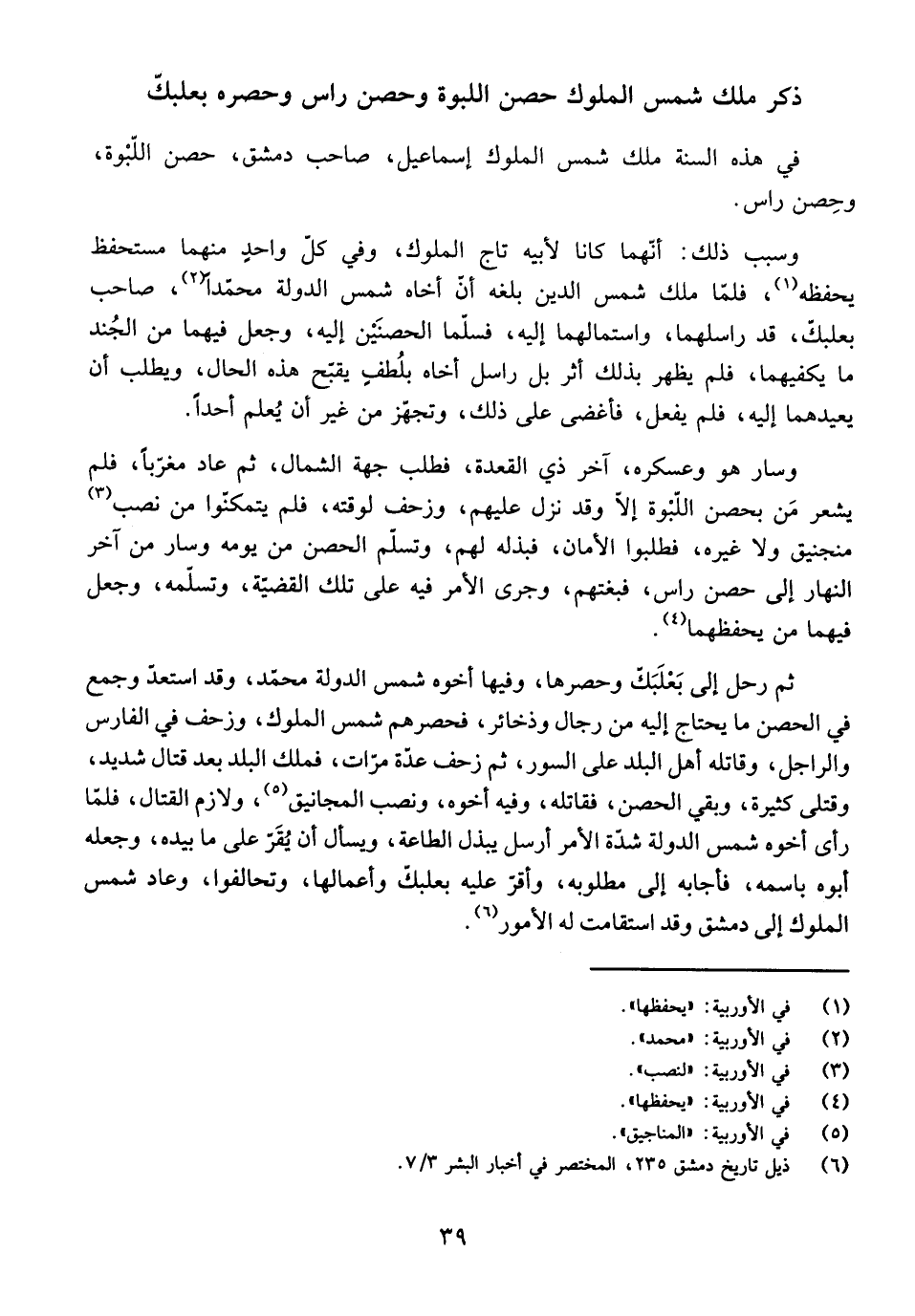 ثُمَّ رَحَلَ إِلَى بَعْلَبَكَّ وَحَصَرَهَا وَفِيهَا أَخُوهُ شَمْسُ الدَّوْلَةِ مُحَمَّدٌ، وَقَدِ اسْتَعَدَّ وَجَمَعَ فِي الْحِصْنِ مَا يَحْتَاجُ إِلَيْهِ مِنْ رِجَالٍ وَذَخَائِرَ، فَحَصَرَهُمْ شَمْسُ الْمُلُوكِ، وَزَحَفَ فِي الْفَارِسِ وَالرَّاجِلِ، وَقَاتَلَهُ أَهْلُ الْبَلَدِ عَلَى السُّورِ، ثُمَّ زَحَفَ عِدَّةَ مَرَّاتٍ، فَمَلَكَ الْبَلَدَ بَعْدَ قِتَالٍ شَدِيدٍ وَقَتْلَى كَثِيرَةٍ، وَبَقِيَ الْحِصْنُ فَقَاتَلَهُ وَفِيهِ أَخُوهُ، وَنَصَبَ الْمَجَانِيقَ، وَلَازَمَ الْقِتَالَ، فَلَمَّا رَأَى أَخُوهُ شَمْسُ الدَّوْلَةِ شِدَّةَ الْأَمْرِ أَرْسَلَ يَبْذُلُ الطَّاعَةَ، وَيَسْأَلُ أَنْ يُقَرَّ عَلَى مَا بِيَدِهِ، وَجَعَلَهُ أَبُوهُ بِاسْمِهِ، فَأَجَابَهُ إِلَى مَطْلُوبِهِ، وَأَقَرَّ عَلَيْهِ بَعْلَبَكَّ وَأَعْمَالَهَا، وَتَحَالَفُوا، وَعَادَ شَمْسُ الْمُلُوكِ إِلَى دِمَشْقَ وَقَدِ اسْتَقَامَتْ لَهُ الْأُمُورُ.