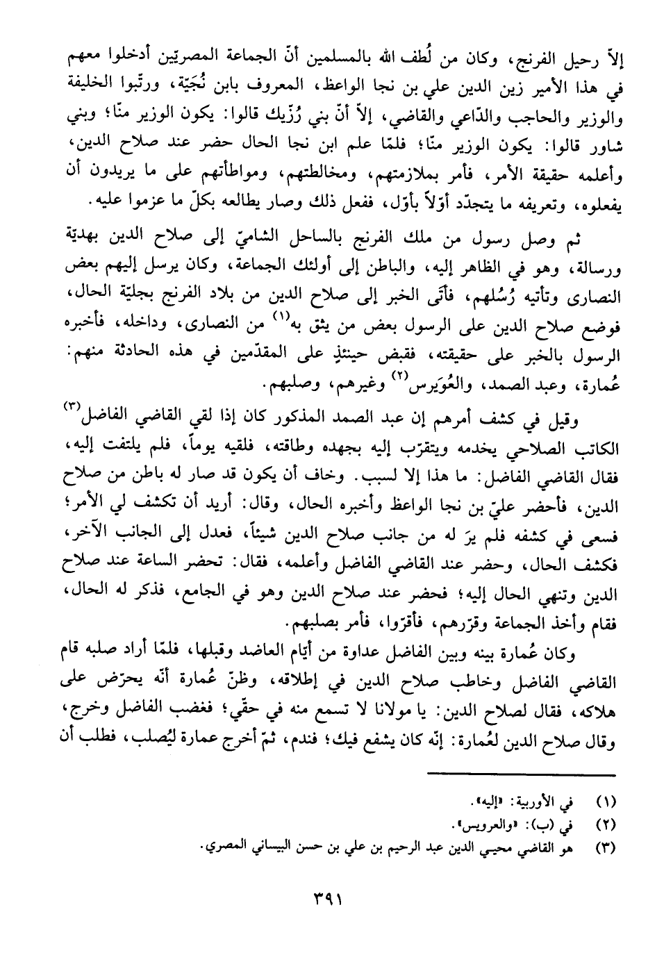 ثُمَّ وَصَلَ رَسُولٌ مِنْ مَلِكِ الْفِرِنْجِ بِالسَّاحِلِ الشَّامِيِّ إِلَى صَلَاحِ الدِّينِ بِهَدِيَّةٍ وَرِسَالَةٍ، وَهُوَ فِي الظَّاهِرِ إِلَيْهِ، وَالْبَاطِنِ إِلَى أُولَئِكَ الْجَمَاعَةِ، وَكَانَ يُرْسِلُ إِلَيْهِمْ بَعْضَ النَّصَارَى وَتَأْتِيهِ رُسُلُهُمْ، فَأَتَى الْخَبَرُ إِلَى صَلَاحِ الدِّينِ مِنْ بِلَادِ الْفِرِنْجِ بِجَلِيَّةِ الْحَالِ، فَوَضَعَ صَلَاحُ الدِّينِ عَلَى الرَّسُولِ بَعْضَ مَنْ يَثِقُ بِهِ مِنَ النَّصَارَى، وَدَاخَلَهُ، فَأَخْبَرَهُ الرَّسُولُ بِالْخَبَرِ عَلَى حَقِيقَتِهِ، فَقَبَضَ حِينَئِذٍ عَلَى الْمُقَدَّمِينَ فِي هَذِهِ الْحَادِثَةِ مِنْهُمْ: عُمَارَةُ وَعَبْدُ الصَّمَدِ وَالْعُوَيْرِسُ وَغَيْرُهُمْ وَصَلَبَهُمْ.