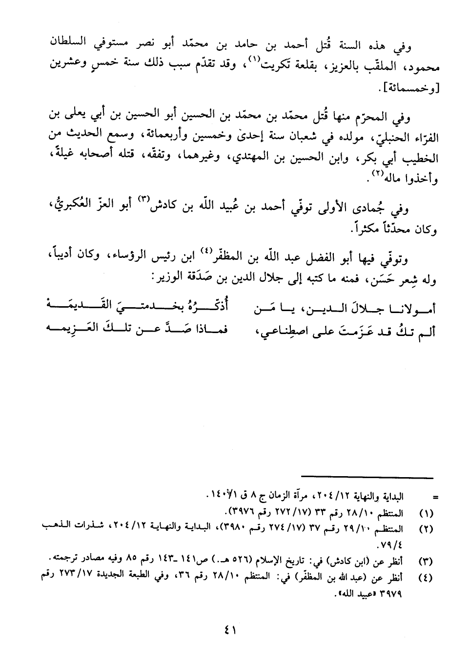 وَتُوُفِّيَ فِيهَا أَبُو الْفَضْلِ عَبْدُ اللَّهِ بْنُ الْمُظَفَّرِ بْنِ رَئِيسِ الرُّؤَسَاءِ، وَكَانَ أَدِيبًا وَلَهُ شِعْرٌ حَسَنٌ، فَمِنْهُ مَا كَتَبَهُ إِلَى جَلَالِ الدِّينِ بْنِ صَدَقَةَ الْوَزِيرِ: