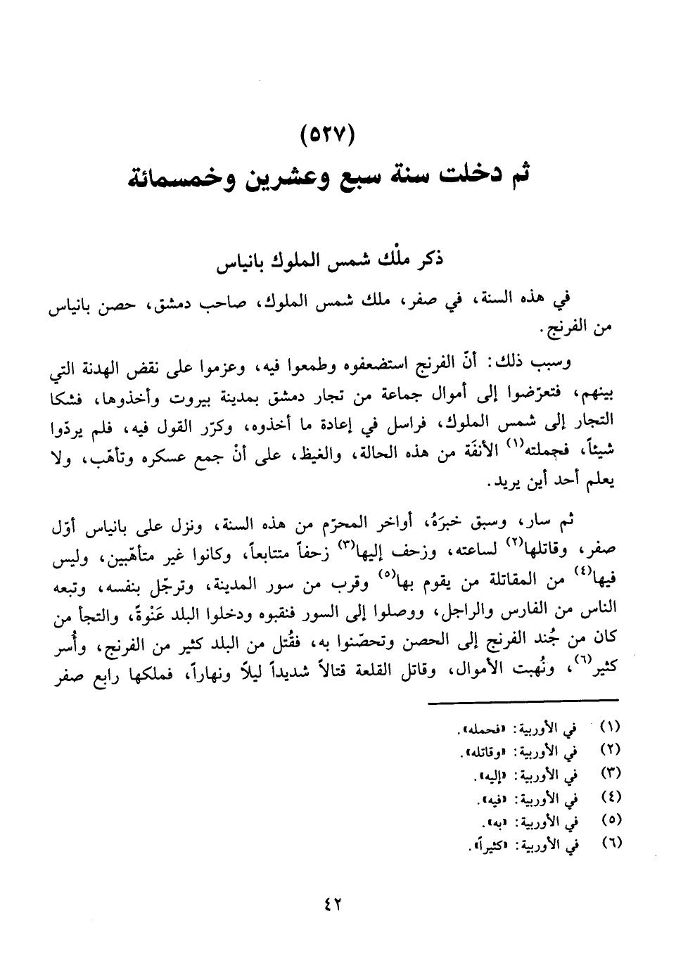 فِي هَذِهِ السَّنَةِ، فِي صَفَرٍ مَلَكَ شَمْسُ الْمُلُوكِ صَاحِبُ دِمَشْقَ حِصْنَ بَانِيَاسَ مِنَ الْفِرِنْجِ.