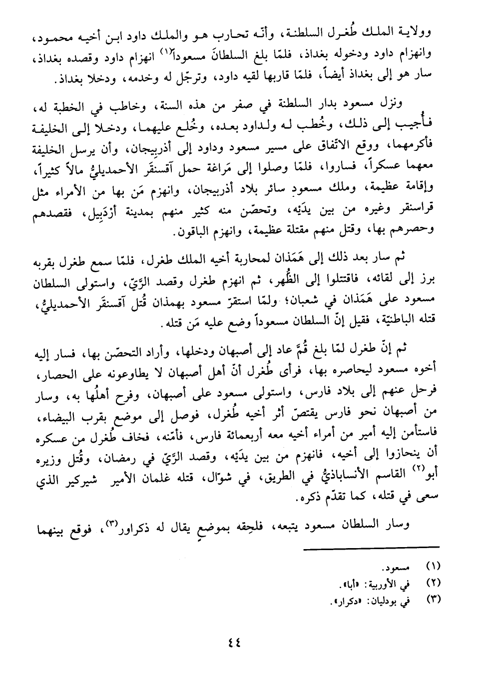 وَوِلَايَةِ الْمَلِكِ طُغْرُلَ السَّلْطَنَةَ، وَأَنَّهُ تَحَارَبَ هُوَ وَالْمَلِكُ دَاوُدُ ابْنُ أَخِيهِ مَحْمُودٍ، وَانْهِزَامِ دَاوُدَ وَدُخُولِهِ بَغْدَاذَ، فَلَمَّا بَلَغَ السُّلْطَانَ مَسْعُودًا انْهِزَامُ دَاوُدَ وَقَصْدُهُ بَغْدَاذَ، سَارَ هُوَ إِلَى بَغْدَاذَ أَيْضًا، فَلَمَّا قَارَبَهَا لَقِيَهُ دَاوُدُ وَتَرَجَّلَ لَهُ، وَخَدَمَهُ، وَدَخَلَا بَغْدَاذَ.