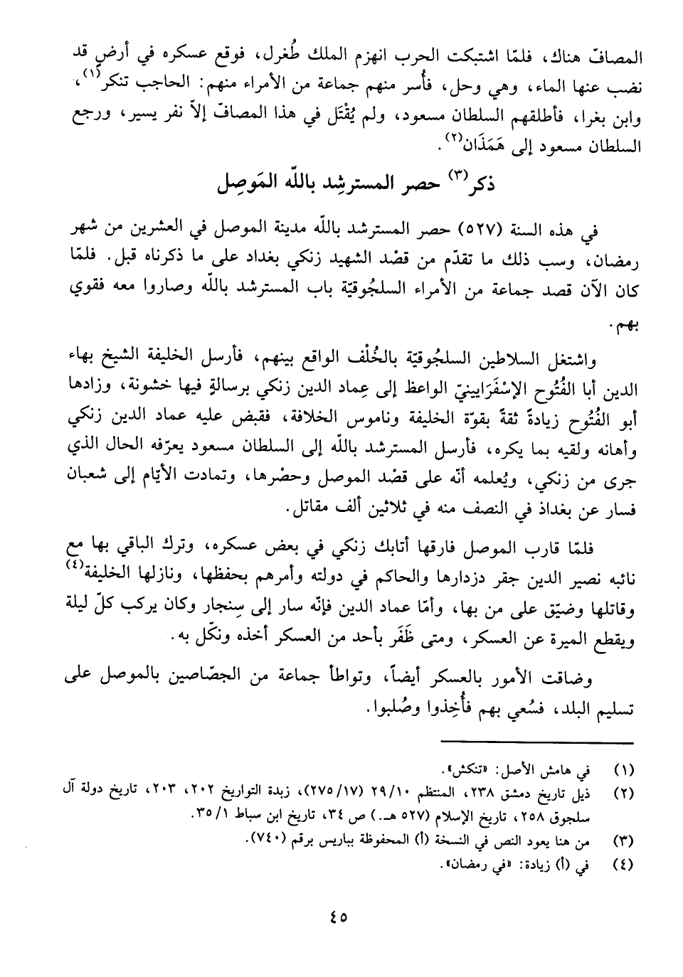 فِي هَذِهِ السَّنَةِ (527) حَصَرَ الْمُسْتَرْشِدُ بِاللَّهِ مَدِينَةَ الْمَوْصِلِ فِي الْعِشْرِينَ مِنْ شَهْرِ رَمَضَانَ، وَسَبَبُ ذَلِكَ مَا تَقَدَّمَ مِنْ قَصْدِ الشَّهِيدِ زَنْكِي بَغْدَادَ عَلَى مَا ذَكَرْنَاهُ قَبْلُ، فَلَمَّا كَانَ الْآنُ قَصَدَ جَمَاعَةٌ مِنَ الْأُمَرَاءِ السَّلْجُوقِيَّةِ بَابَ الْمُسْتَرْشِدِ بِاللَّهِ، وَصَارُوا مَعَهُ فَقَوِيَ بِهِمْ.
