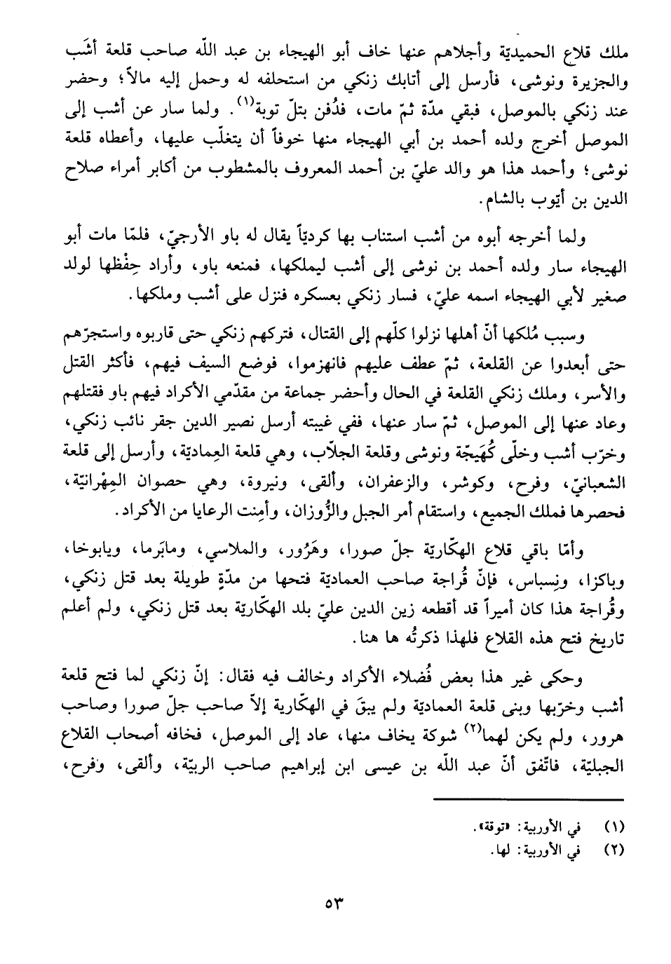 وَأَمَّا بَاقِي قِلَاعِ الْهَكَّارِيَّةِ جَلَّ صُورَ، وَهَرُورُ، وَالْمَلَاسِي، وَمَابَرْمَا، وَيَابُوخَا، وَبَاكِزَا، وَنِسْبَاسُ، فَإِنَّ قُرَاجَةَ صَاحِبَ الْعِمَادِيَّةِ فَتَحَهَا مِنْ مُدَّةٍ طَوِيلَةٍ بَعْدَ قَتْلِ زَنْكِي، وَقُرَاجَةُ هَذَا كَانَ أَمِيرًا قَدْ أَقْطَعَهُ زَيْنُ الدِّينِ عَلِيٌّ بَلَدَ الْهَكَّارِيَّةِ بَعْدَ قَتْلِ زَنْكِي، وَلَمْ أَعْلَمْ تَارِيخَ فَتْحِ هَذِهِ الْقِلَاعِ ;فَلِهَذَا ذَكَرْتُهُ هَاهُنَا.