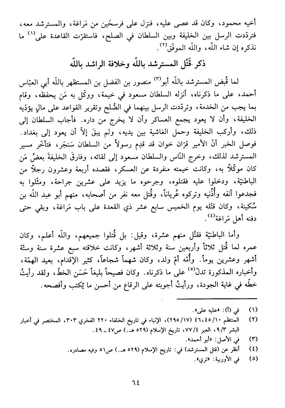 أَخِيهِ مَحْمُودٍ، وَكَانَ قَدْ عَصَى عَلَيْهِ، فَنَزَلَ عَلَى فَرْسَخَيْنِ مِنْ مَرَاغَةَ وَالْمُسْتَرْشِدُ مَعَهُ، فَتَرَدَّدَتِ الرُّسُلُ بَيْنَ الْخَلِيفَةِ وَبَيْنَ السُّلْطَانِ فِي الصُّلْحِ، فَاسْتَقَرَّتِ الْقَاعِدَةُ عَلَى مَا نَذْكُرُهُ إِنْ شَاءَ اللَّهُ، وَاللَّهُ الْمُوَفِّقُ.