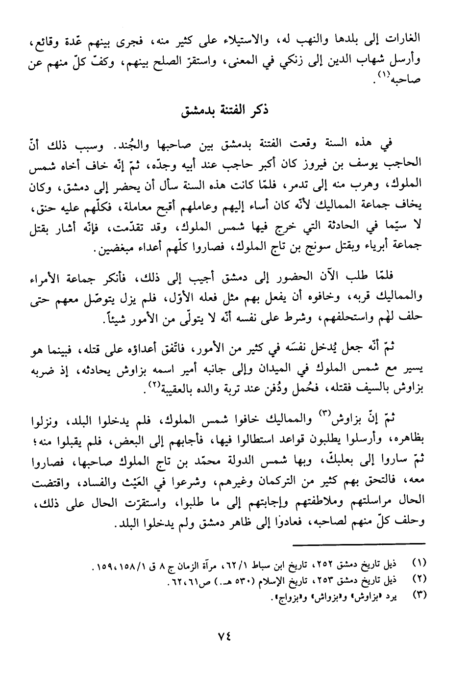 ثُمَّ إِنَّ بَزَاوُشَ وَالْمَمَالِيكَ خَافُوا شَمْسَ الْمُلُوكِ، فَلَمْ يَدْخُلُوا الْبَلَدَ، وَنَزَلُوا بِظَاهِرِهِ، وَأَرْسَلُوا يَطْلُبُونَ قَوَاعِدَ اسْتَطَالُوا فِيهَا، فَأَجَابَهُمْ إِلَى الْبَعْضِ، فَلَمْ يَقْبَلُوا مِنْهُ، ثُمَّ سَارُوا إِلَى بَعْلَبَكَّ وَبِهَا شَمْسُ الدَّوْلَةِ مُحَمَّدُ بْنُ تَاجِ الْمُلُوكِ صَاحِبُهَا، فَصَارُوا مَعَهُ، فَالْتَحَقَ بِهِمْ كَثِيرٌ مِنَ التُّرْكُمَانِ وَغَيْرِهِمْ، وَشَرَعُوا فِي الْعَيْثِ وَالْفَسَادِ، وَاقْتَضَتِ الْحَالُ مُرَاسَلَتَهُمْ وَمُلَاطَفَتَهُمْ وَإِجَابَتَهُمْ إِلَى مَا طَلَبُوا، وَاسْتَقَرَّتِ الْحَالُ عَلَى ذَلِكَ، وَحَلَفَ كُلٌّ مِنْهُمْ لِصَاحِبِهِ، فَعَادُوا إِلَى ظَاهِرِ دِمَشْقَ وَلَمْ يَدْخُلُوا الْبَلَدَ.