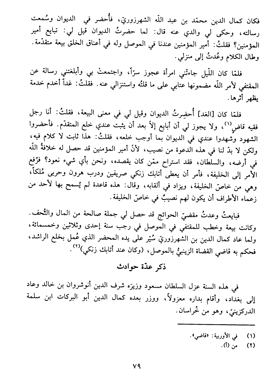فَكَانَ كَمَالُ الدَّيْنِ مُحَمَّدُ بْنُ عَبْدِ اللَّهِ الشَّهْرَزُورِيُّ، فَأُحْضِرَ فِي الدِّيوَانِ، وَسُمِعَتْ رِسَالَتُهُ، وَحَكَى لِي وَالِدِي عَنْهُ قَالَ: