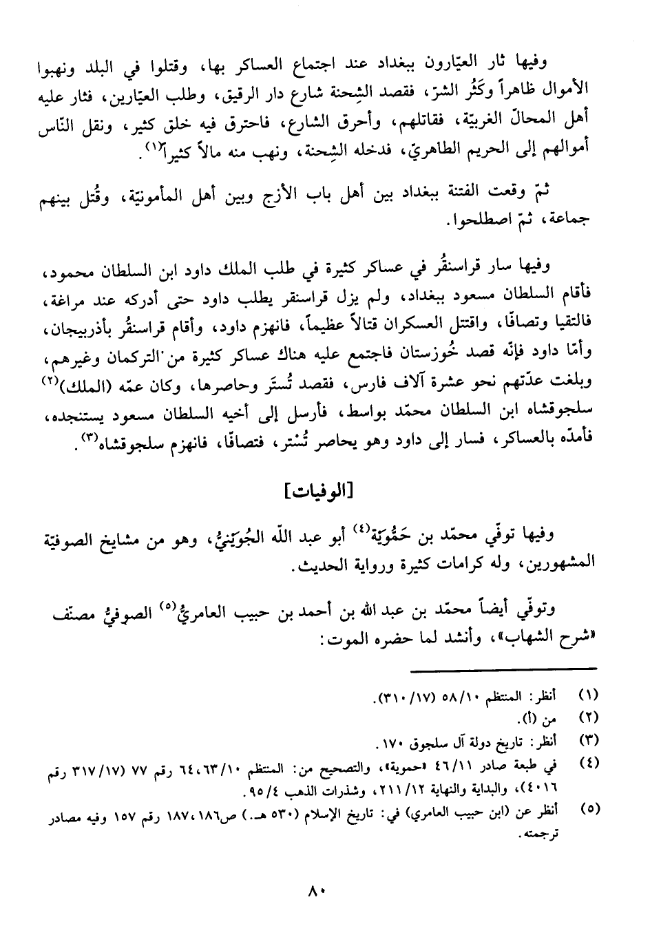 وَفِيهَا ثَارَ الْعَيَّارُونَ بِبَغْدَادَ عِنْدَ اجْتِمَاعِ الْعَسَاكِرِ بِهَا، وَقَتَلُوا فِي الْبَلَدِ، وَنَهَبُوا الْأَمْوَالَ ظَاهِرًا، وَكَثُرَ الشَّرُّ، فَقَصَدَ الشِّحْنَةُ شَارِعَ دَارِ الرَّقِيقِ، وَطَلَبَ الْعَيَّارِينَ، فَثَارَ عَلَيْهِ أَهْلُ الْمَحَالِّ الْغَرْبِيَّةِ، فَقَاتَلَهُمْ، وَأَحْرَقَ الشَّارِعَ، فَاحْتَرَقَ فِيهِ خَلْقٌ كَثِيرٌ، وَنَقَلَ النَّاسُ أَمْوَالَهُمْ إِلَى الْحَرِيمِ الطَّاهِرِيِّ، فَدَخَلَهُ الشِّحْنَةُ، وَنَهَبَ مِنْهُ مَالًا كَثِيرًا.