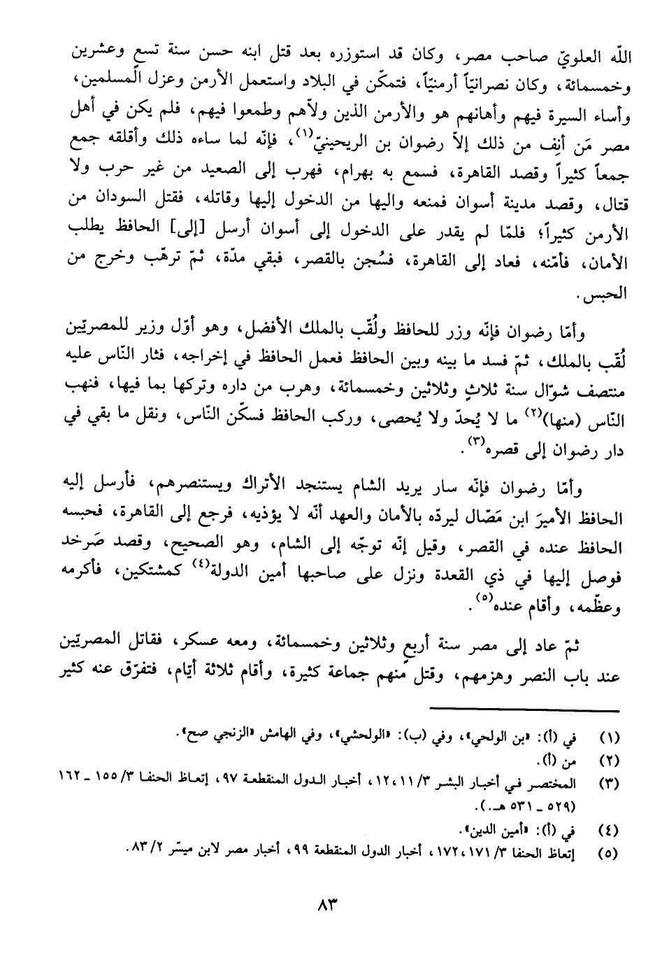 اللَّهِ الْعَلَوِيِّ صَاحِبِ مِصْرَ، وَكَانَ قَدِ اسْتَوْزَرَهُ بَعْدَ قَتْلِ ابْنِهِ حَسَنٍ سَنَةَ تِسْعٍ وَعِشْرِينَ وَخَمْسِمَائَةٍ، وَكَانَ نَصْرَانِيًّا أَرْمَنِيًّا، فَتَمَكَّنَ فِي الْبِلَادِ، وَاسْتَعْمَلَ الْأَرْمَنَ، وَعَزَلَ الْمُسْلِمِينَ، وَأَسَاءَ السِّيرَةَ فِيهِمْ، وَأَهَانَهُمْ هُوَ وَالْأَرْمَنُ الَّذِينَ وَلَّاهُمْ، وَطَمِعُوا فِيهِمْ، فَلَمْ يَكُنْ فِي أَهْلِ مِصْرَ مَنْ أَنِفَ مِنْ ذَلِكَ إِلَّا رِضْوَانُ بْنُ الرَّيْحَيْنِيِّ، فَإِنَّهُ لَمَّا سَاءَهُ ذَلِكَ وَأَقْلَقَهُ جَمَعَ جَمْعًا كَثِيرًا، وَقَصَدَ الْقَاهِرَةَ، فَسَمِعَ بِهِ بَهْرَامُ، فَهَرَبَ إِلَى الصَّعِيدِ مِنْ غَيْرِ حَرْبٍ وَلَا قِتَالٍ، وَقَصَدَ مَدِينَةَ أَسْوَانَ، فَمَنَعَهُ وَالِيهَا مِنَ الدُّخُولِ إِلَيْهَا وَقَاتَلَهُ، فَقَتَلَ السُّودَانُ مِنَ الْأَرْمَنِ كَثِيرًا، فَلَمَّا لَمْ يَقْدِرْ عَلَى الدُّخُولِ إِلَى أَسْوَانَ أَرْسَلَ [إِلَى] الْحَافِظِ يَطْلُبُ الْأَمَانَ فَأَمَّنَهُ، فَعَادَ إِلَى الْقَاهِرَةِ، فَسُجِنَ بِالْقَصْرِ، فَبَقِيَ مُدَّةً، ثُمَّ تَرَهَّبَ وَخَرَجَ مِنَ الْحَبْسِ.
