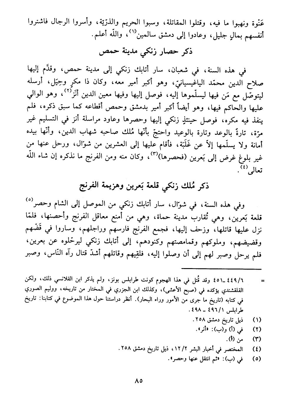 وَفِي هَذِهِ السَّنَةِ فِي شَوَّالٍ سَارَ أَتَابَكْ زَنْكِي مِنَ الْمَوْصِلِ إِلَى الشَّامِ، وَحَصَرَ قَلْعَةَ بَعْرِينَ، وَهِيَ تُقَارِبُ مَدِينَةَ حَمَاةَ، وَهِيَ مِنْ أَمْنَعِ مَعَاقِلِ الْفِرِنْجِ، وَأَحْصَنِهَا، فَلَمَّا نَزَلَ عَلَيْهَا قَاتَلَهَا وَزَحَفَ إِلَيْهَا، فَجَمَعَ الْفِرِنْجُ فَارِسَهُمْ وَرَاجِلَهُمْ، وَسَارُوا فِي قَضِّهِمْ وَقَضِيضِهِمْ وَمُلُوكِهِمْ وَقَمَامِصَتِهِمْ وَكُنُودِهِمْ إِلَى أَتَابَكْ زَنْكِي لِيُرَحِّلُوهُ عَنْ بَعْرِينَ، فَلَمْ يَرْحَلْ، وَصَبَرَ لَهُمْ إِلَى أَنْ وَصَلُوا إِلَيْهِ، فَلَقِيَهُمْ وَقَاتَلَهُمْ أَشَدَّ قِتَالٍ رَآهُ النَّاسُ، وَصَبَرَ