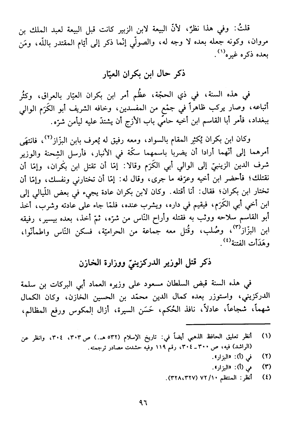 قُلْتُ: وَفِي هَذَا نَظَرٌ؛ لِأَنَّ الْبَيْعَةَ لِابْنِ الزُّبَيْرِ كَانَتْ قَبْلَ الْبَيْعَةِ لِعَبْدِ الْمَلِكِ بْنِ مَرْوَانَ، وَكَوْنُهُ جَعَلَهُ بَعْدَهُ لَا وَجْهَ لَهُ، وَالصُّولِيُّ إِنَّمَا ذَكَرَ إِلَى أَيَّامِ الْمُقْتَدِرِ بِاللَّهِ، وَمَنْ بَعْدَهُ ذَكَرَهُ غَيْرُهُ.