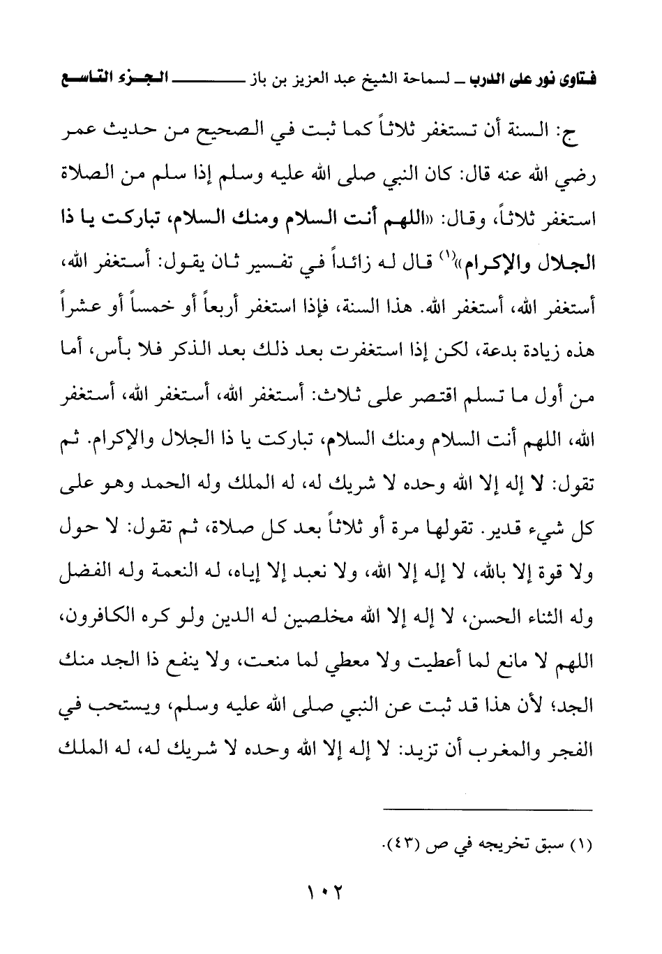 ج: السنة أن تستغفر ثلاثا كما ثبت في الصحيح من حديث عمر رضي الله عنه قال: كان النبي صلى الله عليه وسلم إذا سلم من الصلاة استغفر ثلاثا، وقال: «اللهم أنت السلام ومنك السلام، تباركت يا ذا الجلال والإكرام (¬1)» قال له زائدا في تفسير ثان يقول: أستغفر الله، أستغفر الله، أستغفر الله. هذا السنة، فإذا استغفر أربعا أو خمسا أو عشرا هذه زيادة بدعة، لكن إذا استغفرت بعد ذلك بعد الذكر فلا بأس، أما من أول ما تسلم اقتصر على ثلاث: أستغفر الله، أستغفر الله، أستغفر الله، اللهم أنت السلام ومنك السلام، تباركت يا ذا الجلال والإكرام. ثم تقول: لا إله إلا الله وحده لا شريك له، له الملك وله الحمد وهو على كل شيء قدير.