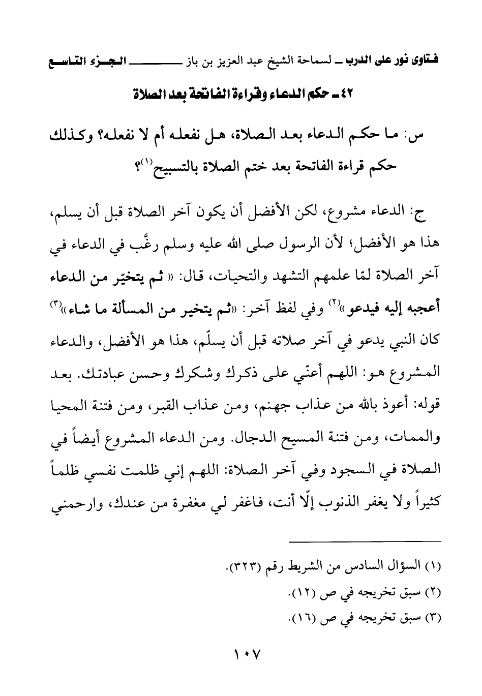 س: ما حكم الدعاء بعد الصلاة، هل نفعله أم لا نفعله؟ وكذلك حكم قراءة الفاتحة بعد ختم الصلاة بالتسبيح (¬1)