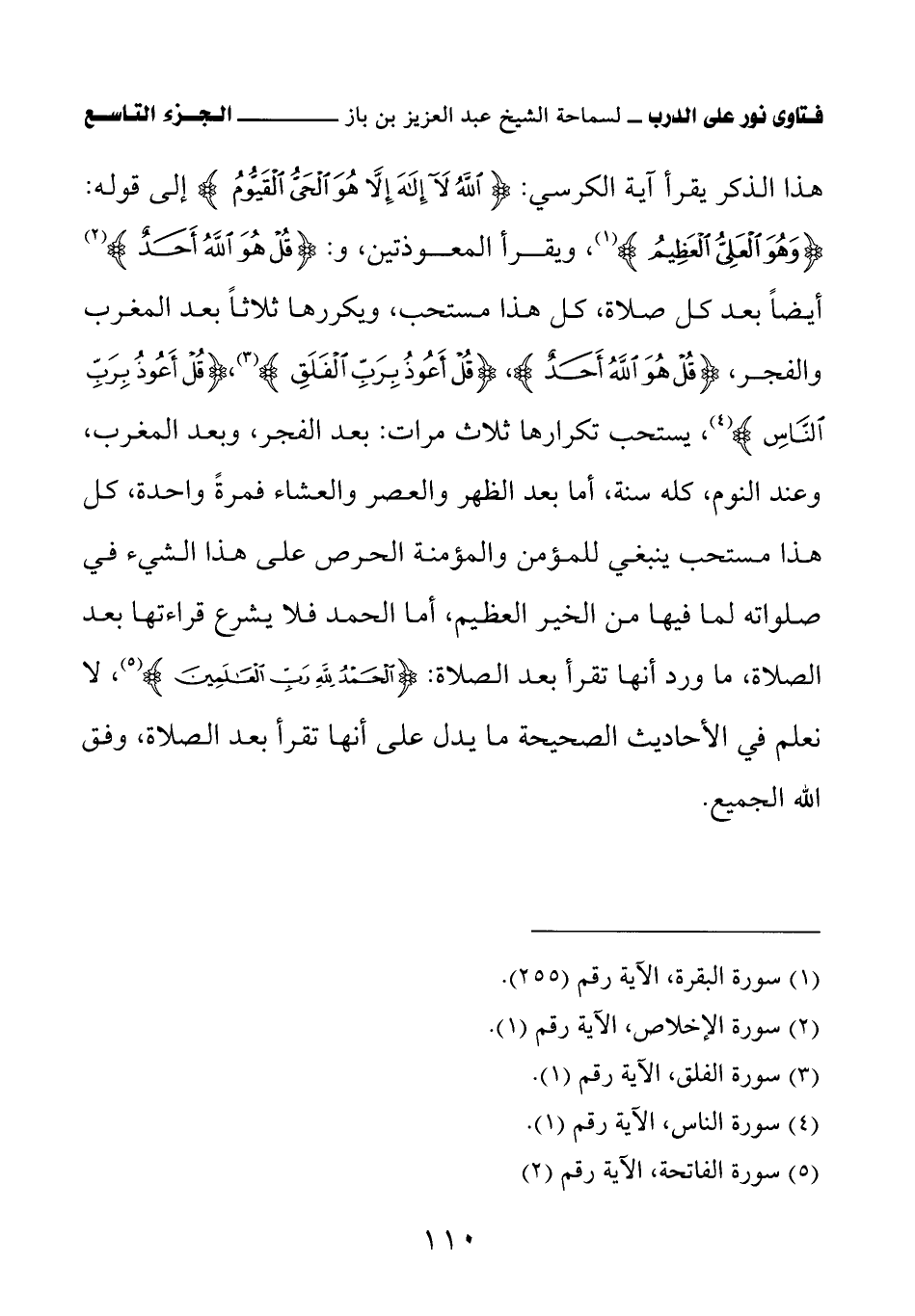هذا الذكر يقرأ آية الكرسي: {اللَّهُ لَا إِلَهَ إِلَّا هُوَ الْحَيُّ الْقَيُّومُ} (¬1) إلى قوله: {وَهُوَ الْعَلِيُّ الْعَظِيمُ} (¬2) ويقرأ المعوذتين، و: {قُلْ هُوَ اللَّهُ أَحَدٌ} (¬3) أيضا بعد كل صلاة، كل هذا مستحب، ويكررها ثلاثا بعد المغرب والفجر، {قُلْ هُوَ اللَّهُ أَحَدٌ} (¬4)، {قُلْ أَعُوذُ بِرَبِّ الْفَلَقِ} (¬5)، {قُلْ أَعُوذُ بِرَبِّ النَّاسِ} (¬6)، يستحب تكرارها ثلاث مرات: بعد الفجر، وبعد المغرب، وعند النوم، كله سنة، أما بعد الظهر والعصر والعشاء فمرة واحدة، كل هذا مستحب ينبغي للمؤمن والمؤمنة الحرص على هذا الشيء في صلواته لما فيها من الخير العظيم، أما الحمد فلا يشرع قراءتها بعد الصلاة، ما ورد أنها تقرأ بعد الصلاة: {الْحَمْدُ لِلَّهِ رَبِّ الْعَالَمِينَ} (¬7) لا نعلم في الأحاديث الصحيحة ما يدل على أنها تقرأ بعد الصلاة، وفق الله الجميع.