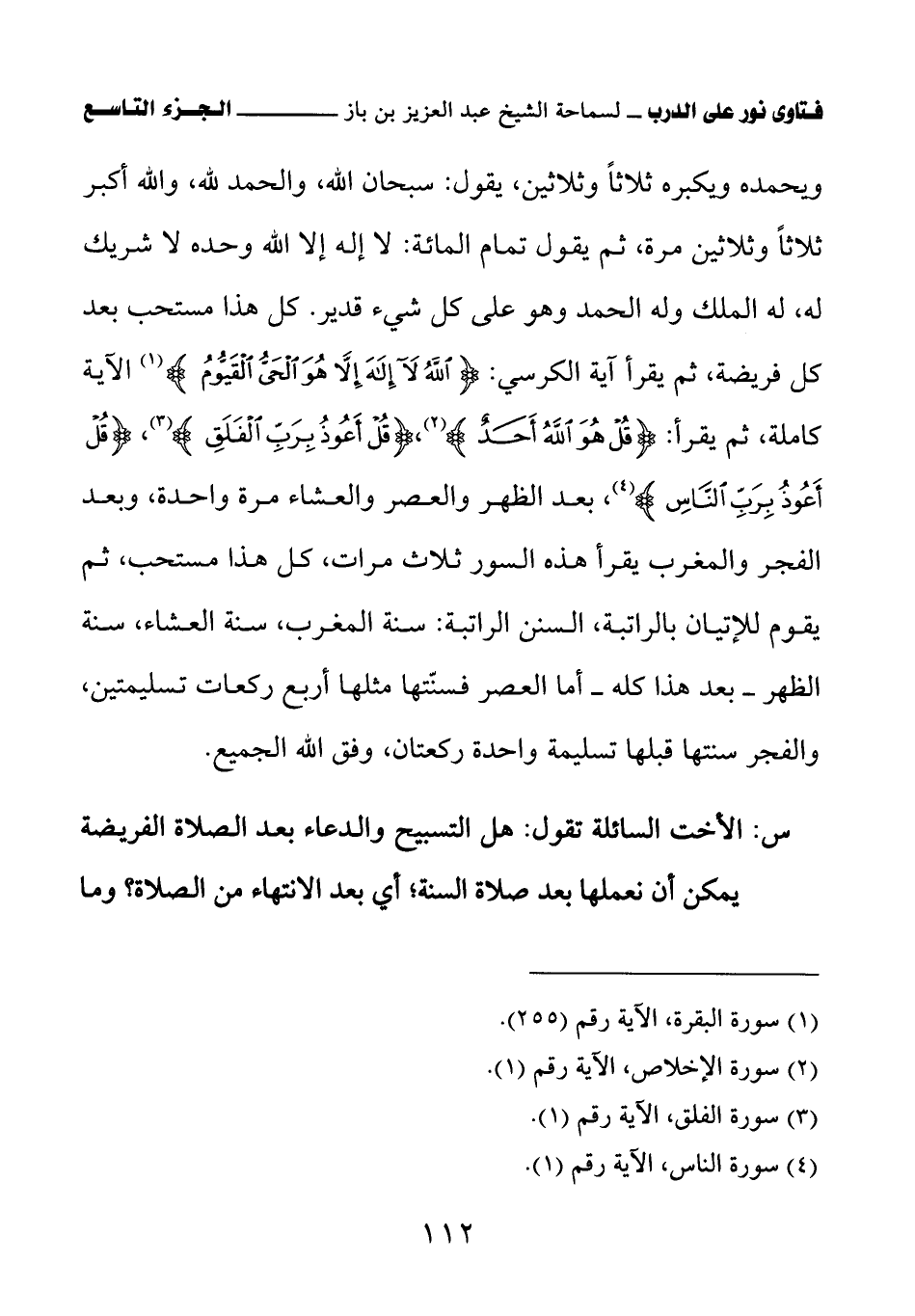 كل هذا مستحب بعد كل فريضة، ثم يقرأ آية الكرسي: {اللَّهُ لَا إِلَهَ إِلَّا هُوَ الْحَيُّ الْقَيُّومُ} (¬1) الآية كاملة، ثم يقرأ: {قُلْ هُوَ اللَّهُ أَحَدٌ} (¬2) {قُلْ أَعُوذُ بِرَبِّ الْفَلَقِ} (¬3)، {قُلْ أَعُوذُ بِرَبِّ النَّاسِ} (¬4) بعد الظهر والعصر والعشاء مرة واحدة، وبعد الفجر والمغرب يقرأ هذه السور ثلاث مرات، كل هذا مستحب، ثم يقوم للإتيان بالراتبة، السنن الراتبة: سنة المغرب، سنة العشاء، سنة الظهر – بعد هذا كله – أما العصر فسنتها مثلها أربع ركعات تسليمتين، والفجر سنتها قبلها تسليمة واحدة ركعتان، وفق الله الجميع.