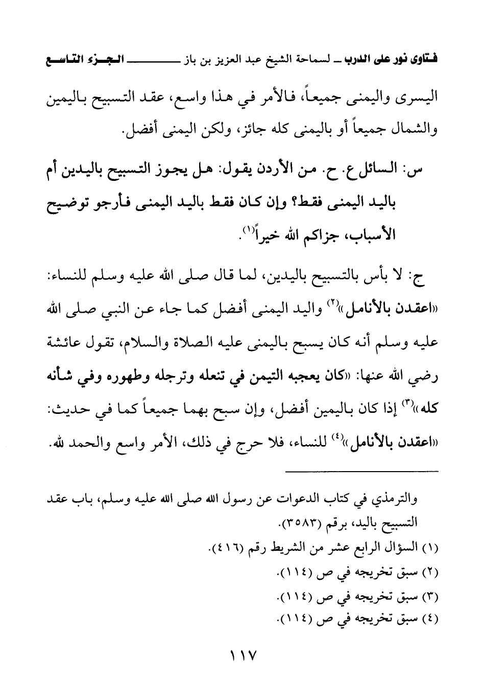 ج: لا بأس بالتسبيح باليدين، لما قال صلى الله عليه وسلم للنساء: «اعقدن بالأنامل (¬2)» واليد اليمنى أفضل كما جاء عن النبي صلى الله عليه وسلم أنه كان يسبح باليمنى عليه الصلاة والسلام، تقول عائشة رضي الله عنها: «كان يعجبه التيمن في تنعله وترجله وطهوره وفي شأنه كله (¬3)» إذا كان باليمين أفضل، وإن سبح بهما جميعا كما في حديث: «اعقدن بالأنامل (¬4)» للنساء، فلا حرج في ذلك، الأمر واسع والحمد لله.