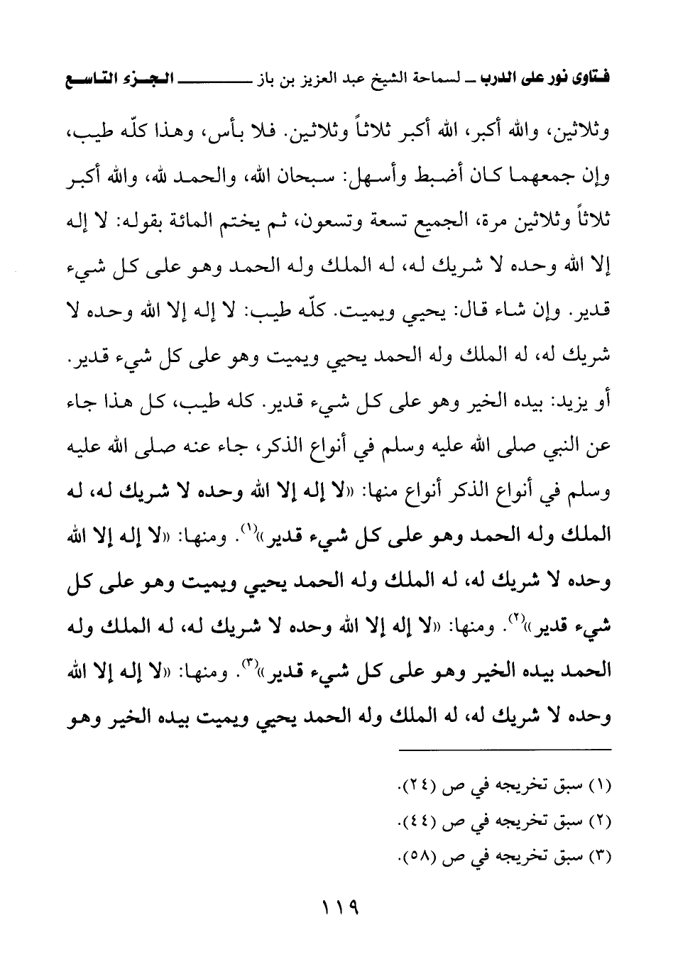 وثلاثين، والله أكبر، الله أكبر ثلاثا وثلاثين. فلا بأس، وهذا كله طيب، وإن جمعهما كان أضبط وأسهل: سبحان الله، والحمد لله، والله أكبر ثلاثا وثلاثين مرة، الجميع تسعة وتسعون، ثم يختم المائة بقوله: لا إله إلا الله وحده لا شريك له، له الملك وله الحمد وهو على كل شيء قدير. وإن شاء قال: يحيي ويميت. كله طيب: لا إله إلا الله وحده لا شريك له، له الملك وله الحمد يحيي ويميت وهو على كل شيء قدير. أو يزيد: بيده الخير وهو على كل شيء قدير. كله طيب، كل هذا جاء عن النبي صلى الله عليه وسلم في أنواع الذكر، جاء عنه صلى الله عليه وسلم في أنواع الذكر أنواع منها: «لا إله إلا الله وحده لا شريك له، له الملك وله الحمد وهو على كل شيء قدير (¬1)»