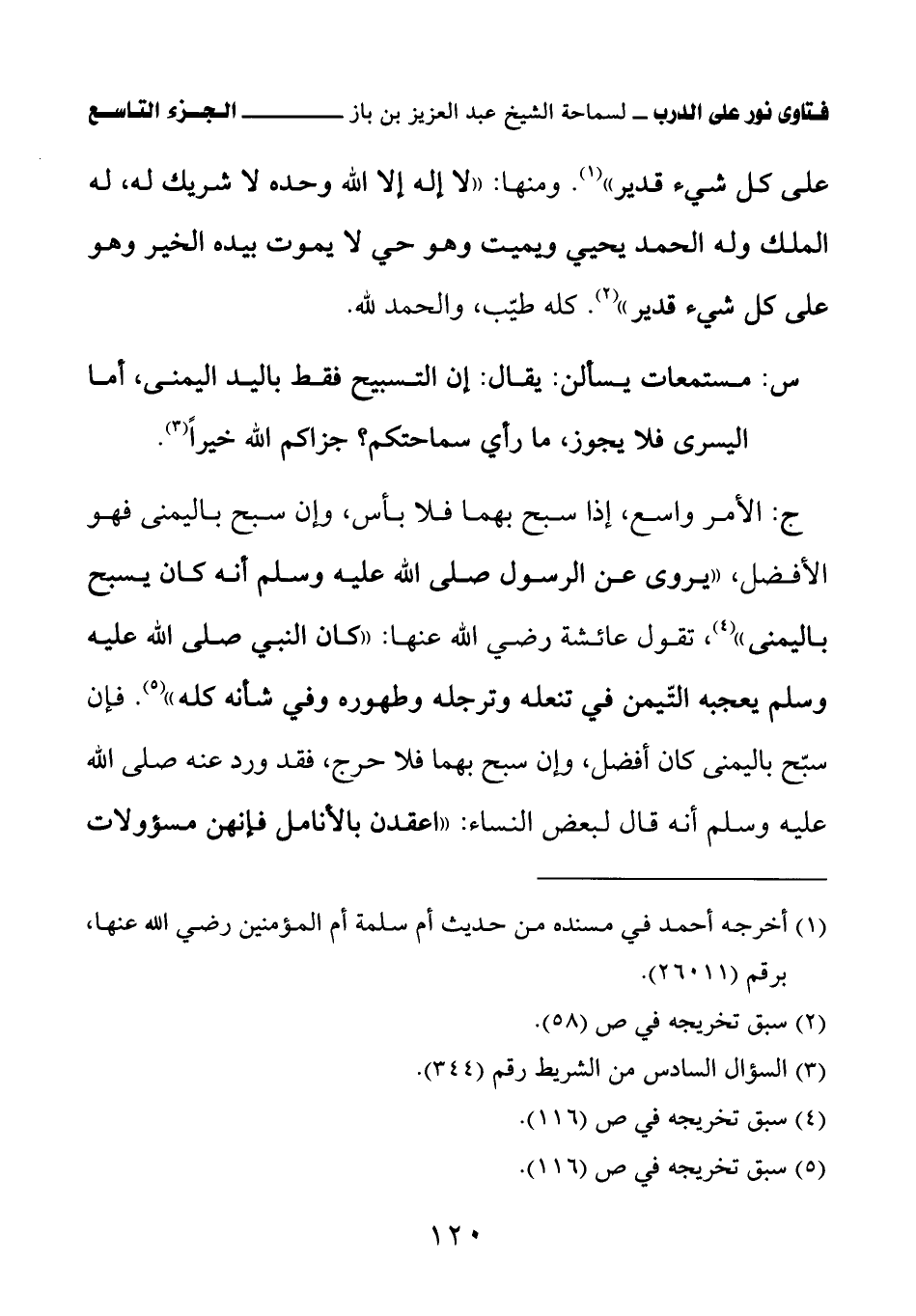 س: مستمعات يسألن: يقال: إن التسبيح فقط باليد اليمنى، أما اليسرى فلا يجوز، ما رأي سماحتكم؟ جزاكم الله خيرا (¬1)