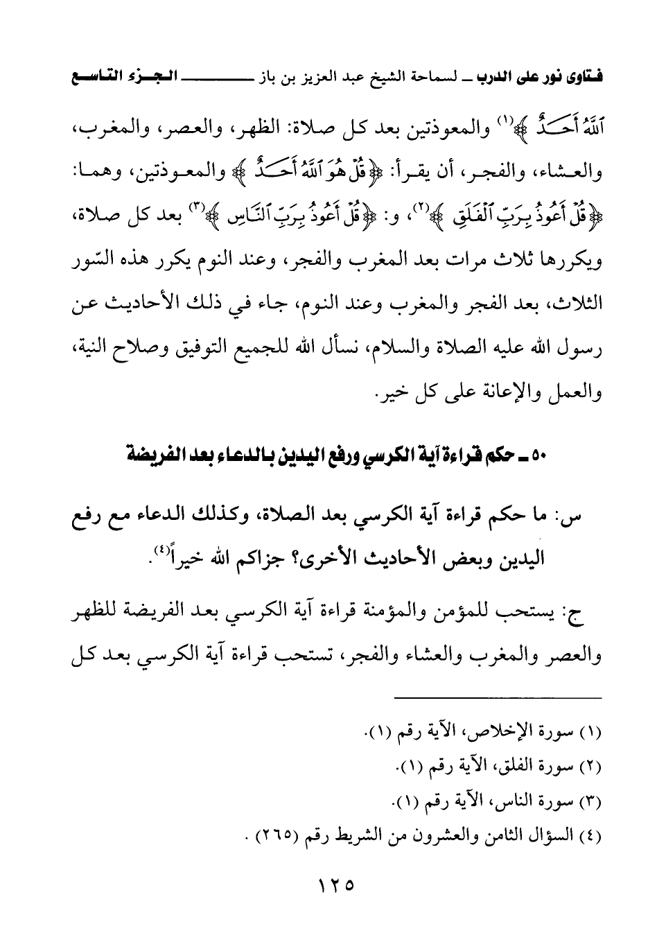 {قُلْ هُوَ اللَّهُ أَحَدٌ} (¬1) والمعوذتين بعد كل صلاة: الظهر، والعصر، والمغرب، والعشاء، والفجر، أن يقرأ: {قُلْ هُوَ اللَّهُ أَحَدٌ} (¬2) والمعوذتين، وهما: {قُلْ أَعُوذُ بِرَبِّ الْفَلَقِ} (¬3) و: {قُلْ أَعُوذُ بِرَبِّ النَّاسِ} (¬4) بعد كل صلاة، ويكررها ثلاث مرات بعد المغرب والفجر، وعند النوم يكرر هذه السور الثلاث، بعد الفجر والمغرب وعند النوم، جاء في ذلك الأحاديث عن رسول الله عليه الصلاة والسلام، نسأل الله للجميع التوفيق وصلاح النية، والعمل والإعانة على كل خير.