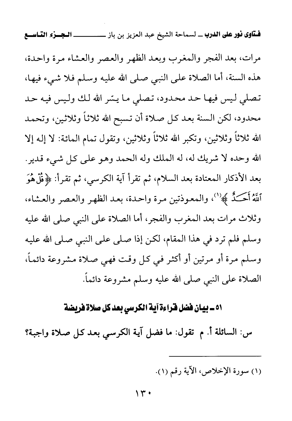 مرات، بعد الفجر والمغرب وبعد الظهر والعصر والعشاء مرة واحدة، هذه السنة، أما الصلاة على النبي صلى الله عليه وسلم فلا شيء فيها، تصلي ليس فيها حد محدود، تصلي ما يسر الله لك وليس فيه حد محدود، لكن السنة بعد كل صلاة أن تسبح الله ثلاثا وثلاثين، وتحمد الله ثلاثا وثلاثين، وتكبر الله ثلاثا وثلاثين، وتقول تمام المائة: لا إله إلا الله وحده لا شريك له، له الملك وله الحمد وهو على كل شيء قدير. بعد الأذكار المعتادة بعد السلام، ثم تقرأ آية الكرسي، ثم تقرأ: {قُلْ هُوَ اللَّهُ أَحَدٌ} (¬1) والمعوذتين مرة واحدة، بعد الظهر والعصر والعشاء، وثلاث مرات بعد المغرب والفجر، أما الصلاة على النبي صلى الله عليه وسلم فلم ترد في هذا المقام، لكن إذا صلى على النبي صلى الله عليه وسلم مرة أو مرتين أو أكثر في كل وقت فهي صلاة مشروعة دائما، الصلاة على النبي صلى الله عليه وسلم مشروعة دائما.