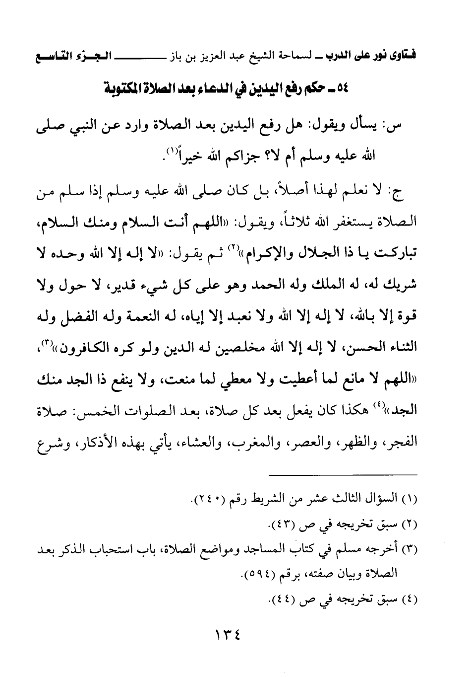 ج: لا نعلم لهذا أصلا، بل كان صلى الله عليه وسلم إذا سلم من الصلاة يستغفر الله ثلاثا، ويقول: «اللهم أنت السلام ومنك السلام، تباركت يا ذا الجلال والإكرام (¬2)» ثم يقول: «لا إله إلا الله وحده لا شريك له، له الملك وله الحمد وهو على كل شيء قدير، لا حول ولا قوة إلا بالله، لا إله إلا الله ولا نعبد إلا إياه، له النعمة وله الفضل وله الثناء الحسن، لا إله إلا الله مخلصين له الدين ولو كره الكافرون (¬3)» «اللهم لا مانع لما أعطيت ولا معطي لما منعت، ولا ينفع ذا الجد منك الجد (¬4)» هكذا كان يفعل بعد كل صلاة، بعد الصلوات الخمس: صلاة الفجر، والظهر، والعصر، والمغرب، والعشاء، يأتي بهذه الأذكار، وشرع