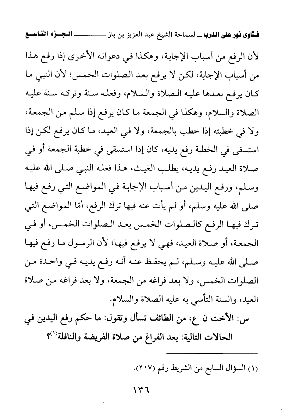 س: الأخت ن. ع، من الطائف تسأل وتقول: ما حكم رفع اليدين في الحالات التالية: بعد الفراغ من صلاة الفريضة والنافلة (¬1)
