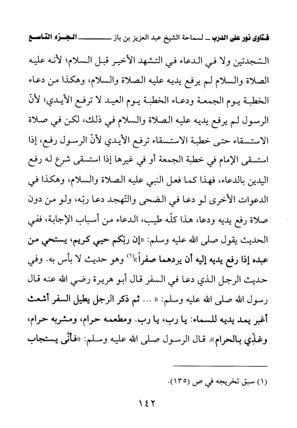 السجدتين ولا في الدعاء في التشهد الأخير قبل السلام؛ لأنه عليه الصلاة والسلام لم يرفع يديه عليه الصلاة والسلام، وهكذا من دعاء الخطبة يوم الجمعة ودعاء الخطبة يوم العيد لا ترفع الأيدي؛ لأن الرسول لم يرفع يديه عليه الصلاة والسلام في ذلك، لكن في صلاة الاستسقاء حتى خطبة الاستسقاء ترفع الأيدي؛ لأن الرسول رفع، إذا استسقى الإمام في خطبة الجمعة أو في غيرها إذا استسقى شرع له رفع اليدين بالدعاء.