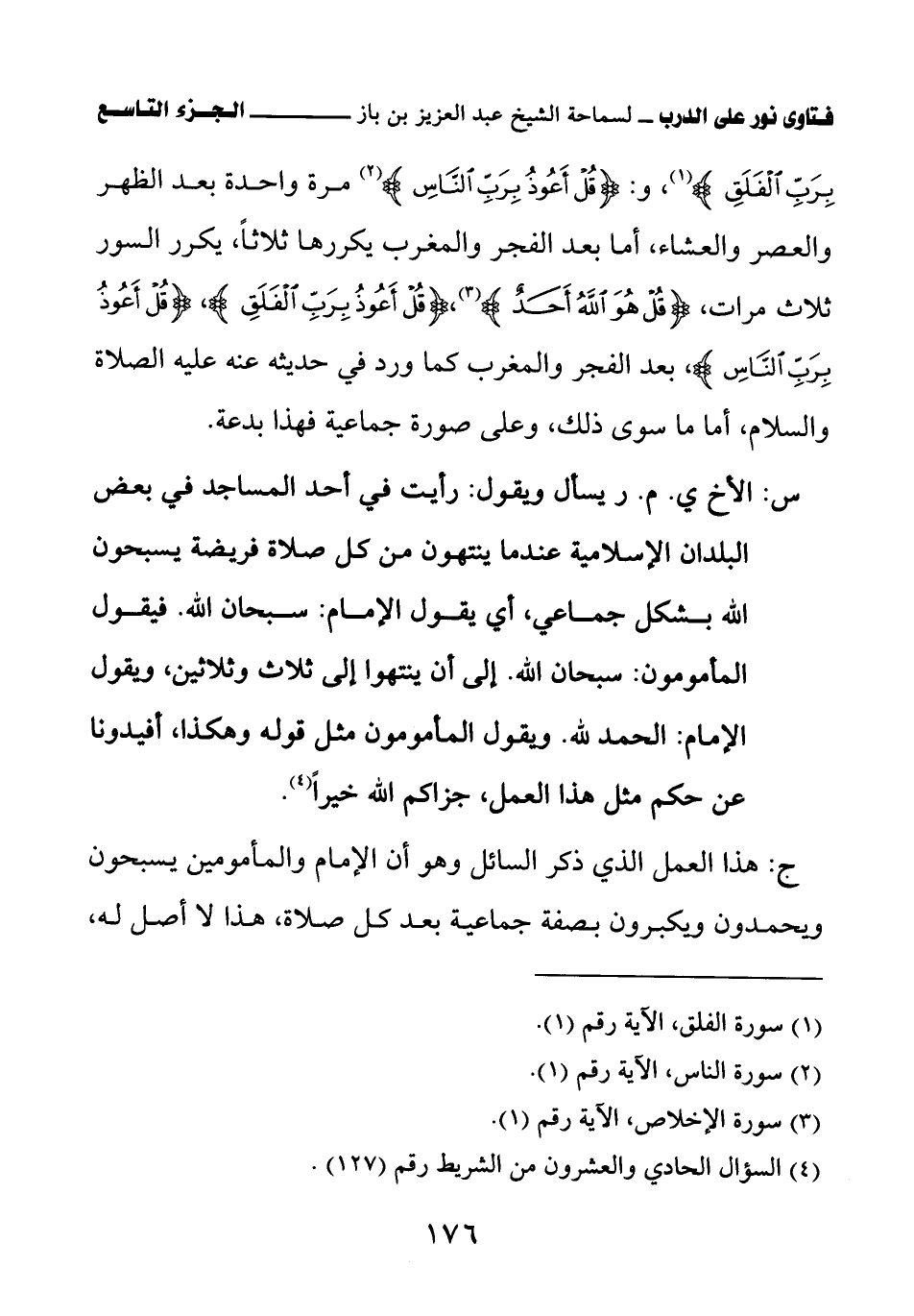 و: {قُلْ أَعُوذُ بِرَبِّ النَّاسِ} (¬1) مرة واحدة بعد الظهر والعصر والعشاء، أما بعد الفجر يكررها ثلاثا، يكرر السور ثلاث مرات، {قُلْ هُوَ اللَّهُ أَحَدٌ} (¬2)، {قُلْ أَعُوذُ بِرَبِّ الْفَلَقِ} (¬3)، {قُلْ أَعُوذُ بِرَبِّ النَّاسِ} (¬4) بعد الفجر والمغرب كما ورد في حديثه عنه عليه الصلاة والسلام، أما ما سوى ذلك، وعلى صورة جماعية فهذا بدعة.