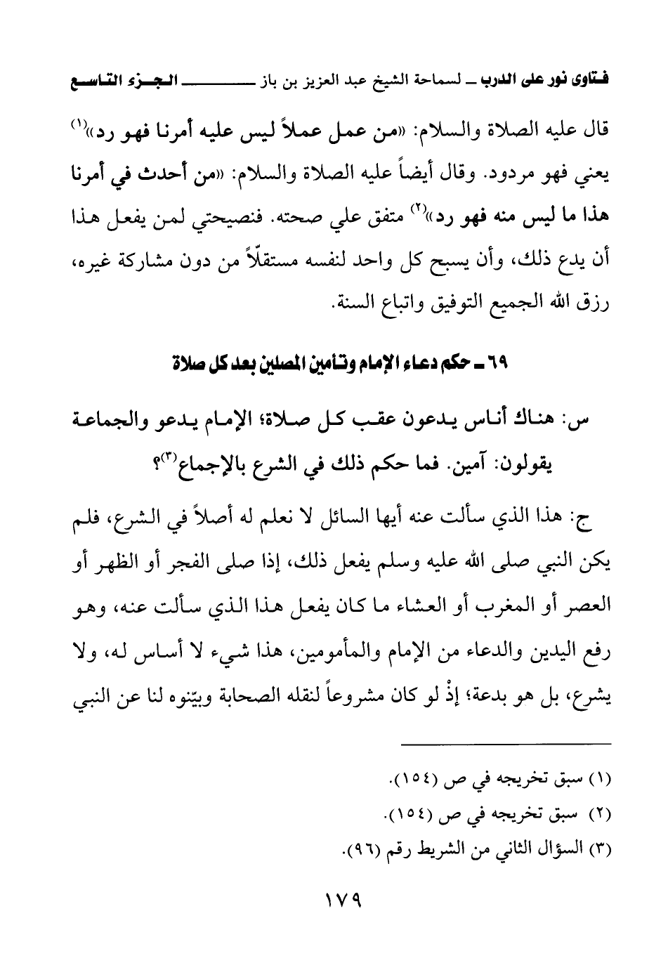 قال عليه الصلاة والسلام: «من عمل عملا ليس عليه أمرنا فهو رد (¬1)» يعني فهو مردود. وقال أيضا عليه الصلاة والسلام: «من أحدث في أمرنا هذا ما ليس منه فهو رد (¬2)» متفق على صحته. فنصيحتي لمن يفعل هذا أن يدع ذلك، وأن يسبح كل واحد لنفسه مستقلا من دون مشاركة غيره، رزق الله الجميع التوفيق واتباع السنة.