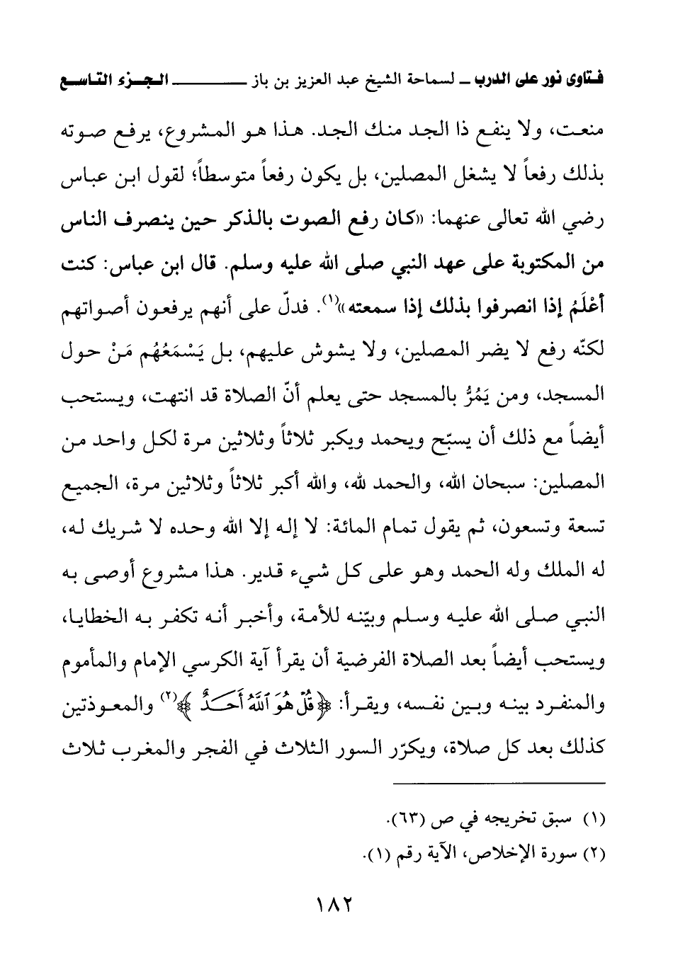 منعت، ولا ينفع ذا الجد منك الجد. هذا هو المشروع، يرفع صوته بذلك رفعا لا يشغل المصلين، بل يكون رفعا متوسطا؛ لقول ابن عباس رضي الله تعالى عنهما: «كان رفع الصوت بالذكر حين ينصرف الناس من المكتوبة على عهد النبي صلى الله عليه وسلم. قال ابن عباس: كنت أعلم إذا انصرفوا بذلك إذا سمعته (¬1)» فدل على أنهم يرفعون أصواتهم لكنه رفع لا يضر المصلين، ولا يشوش عليهم، بل يسمعهم من حول المسجد، ومن يمر بالمسجد حتى يعلم أن الصلاة قد انتهت، ويستحب أيضا مع ذلك أن يسبح ويحمد ويكبر ثلاثا وثلاثين مرة لكل واحد من المصلين: سبحان الله، والحمد لله، والله أكبر ثلاثا وثلاثين مرة، الجميع تسعة وتسعون، ثم يقول تمام المائة: لا إله إلا الله وحده لا شريك له، له الملك وله الحمد وهو على كل شيء قدير. هذا مشروع أوصى به النبي صلى الله عليه وسلم وبينه للأمة، وأخبر أنه تكفر به الخطايا، ويستحب أيضا بعد الصلاة الفرضية أن يقرأ آية الكرسي الإمام والمأموم والمنفرد بينه وبين نفسه، ويقرأ: {قُلْ هُوَ اللَّهُ أَحَدٌ} (¬2) والمعوذتين كذلك بعد كل صلاة، ويكرر السور الثلاث في الفجر والمغرب ثلاث