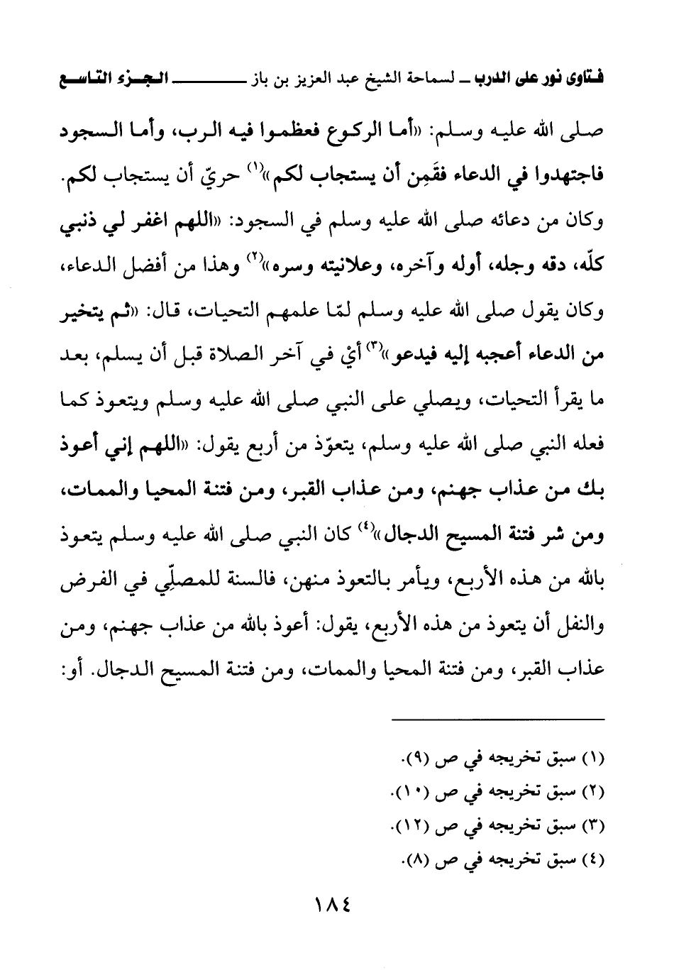 صلى الله عليه وسلم: «أما الركوع فعظموا فيه الرب، وأما السجود فاجتهدوا في الدعاء فقمن أن يستجاب لكم (¬1)» حري أن يستجاب لكم. وكان من دعائه صلى الله عليه وسلم في السجود: «اللهم اغفر لي ذنبي كله، دقه وجله، أوله وآخره، وعلانيته وسره (¬2)» وهذا من أفضل الدعاء، وكان يقول صلى الله عليه وسلم لما علمهم التحيات، قال: «ثم يتخير من الدعاء أعجبه إليه فيدعو (¬3)» أي في آخر الصلاة قبل أن يسلم، بعد ما يقرأ التحيات، ويصلي على النبي صلى الله عليه وسلم ويتعوذ كما فعله النبي صلى الله عليه وسلم، يتعوذ من أربع يقول: «اللهم إني أعوذ بك من عذاب جهنم، ومن عذاب القبر، ومن فتنة المحيا والممات، ومن شر فتنة المسيح الدجال (¬4)» كان النبي صلى الله عليه وسلم يتعوذ بالله من هذه الأربع، ويأمر بالتعوذ منهن، فالسنة للمصلي في الفرض والنفل أن يتعوذ من هذه الأربع، يقول: أعوذ بالله من عذاب جهنم، ومن عذاب القبر، ومن فتنة المحيا والممات، ومن فتنة المسيح الدجال. أو: