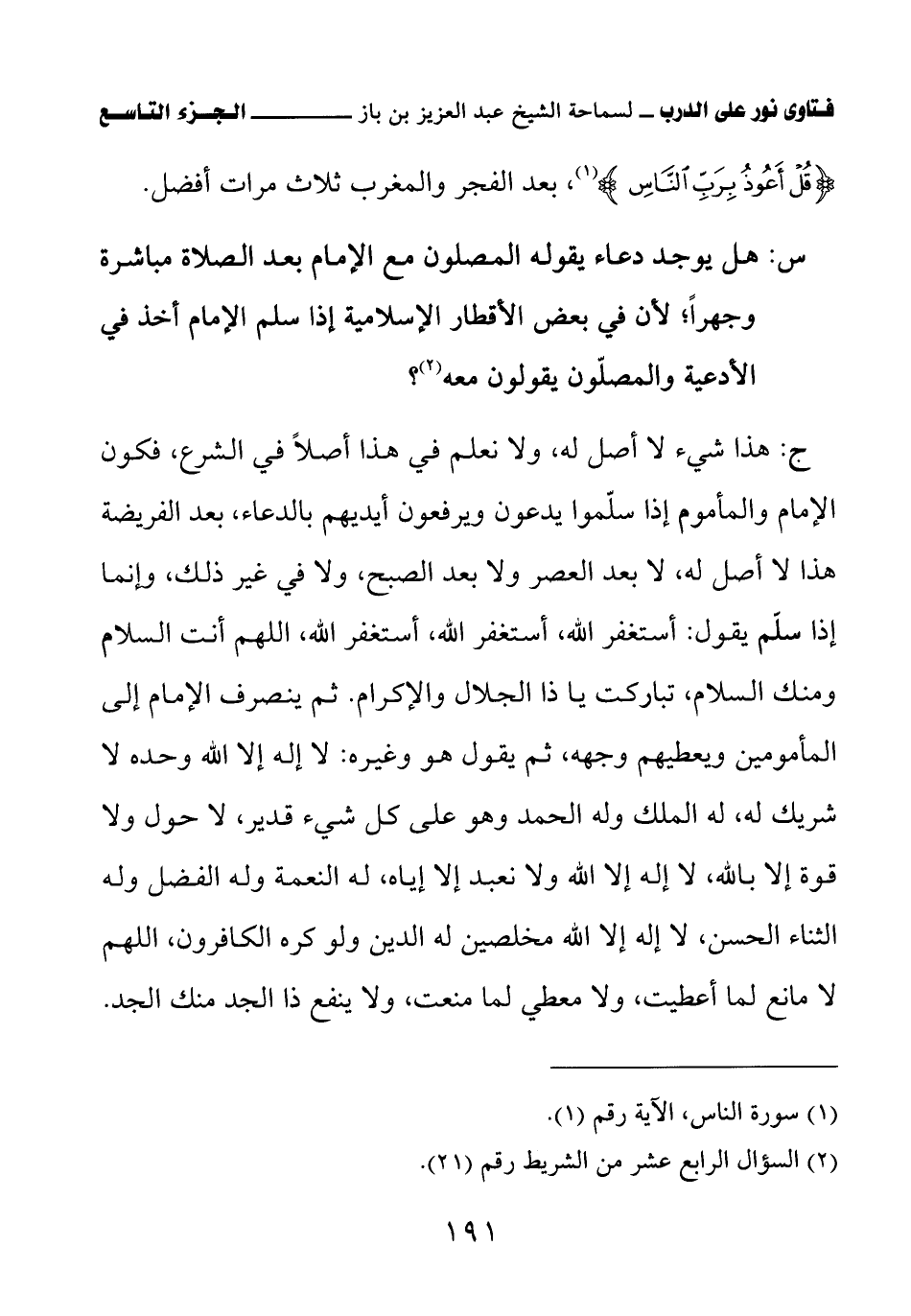 ج: هذا شيء لا أصل له، ولا نعلم في هذا أصلا في الشرع، فكون الإمام والمأموم إذا سلموا يدعون ويرفعون أيديهم بالدعاء، بعد الفريضة هذا لا أصل له، لا بعد العصر ولا بعد الصبح، ولا في غير ذلك، وإنما إذا سلم يقول: أستغفر الله، أستغفر الله، أستغفر الله، اللهم أنت السلام ومنك السلام، تباركت يا ذا الجلال والإكرام. ثم ينصرف الإمام إلى المأمومين ويعطيهم وجهه، ثم يقول هو وغيره: لا إله إلا الله وحده لا شريك له، له الملك وله الحمد وهو على كل شيء قدير، لا حول ولا قوة إلا بالله، لا إله إلا الله ولا نعبد إلا إياه، له النعمة وله الفضل وله الثناء الحسن، لا إله إلا الله مخلصين له الدين ولو كره الكافرون، اللهم لا مانع لما أعطيت، ولا معطي لما منعت، ولا ينفع ذا الجد منك الجد.