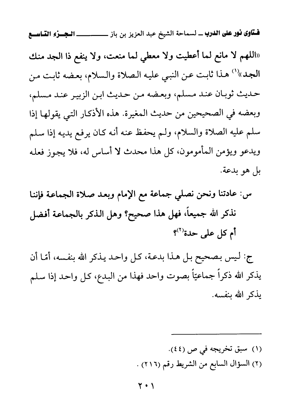" «اللهم لا مانع لما أعطيت ولا معطي لما منعت، ولا ينفع ذا الجد منك الجد (¬1)» هذا ثابت عن النبي عليه الصلاة والسلام، بعضه ثابت من حديث ثوبان عند مسلم، وبعضه من حديث ابن الزبير عند مسلم، وبعضه في الصحيحين من حديث المغيرة. هذه الأذكار التي يقولها إذا سلم عليه الصلاة والسلام، ولم يحفظ عنه أنه كان يرفع يديه إذا سلم ويدعو ويؤمن المأمومون، كل هذا محدث لا أساس له، فلا يجوز فعله، بل هو بدعة.