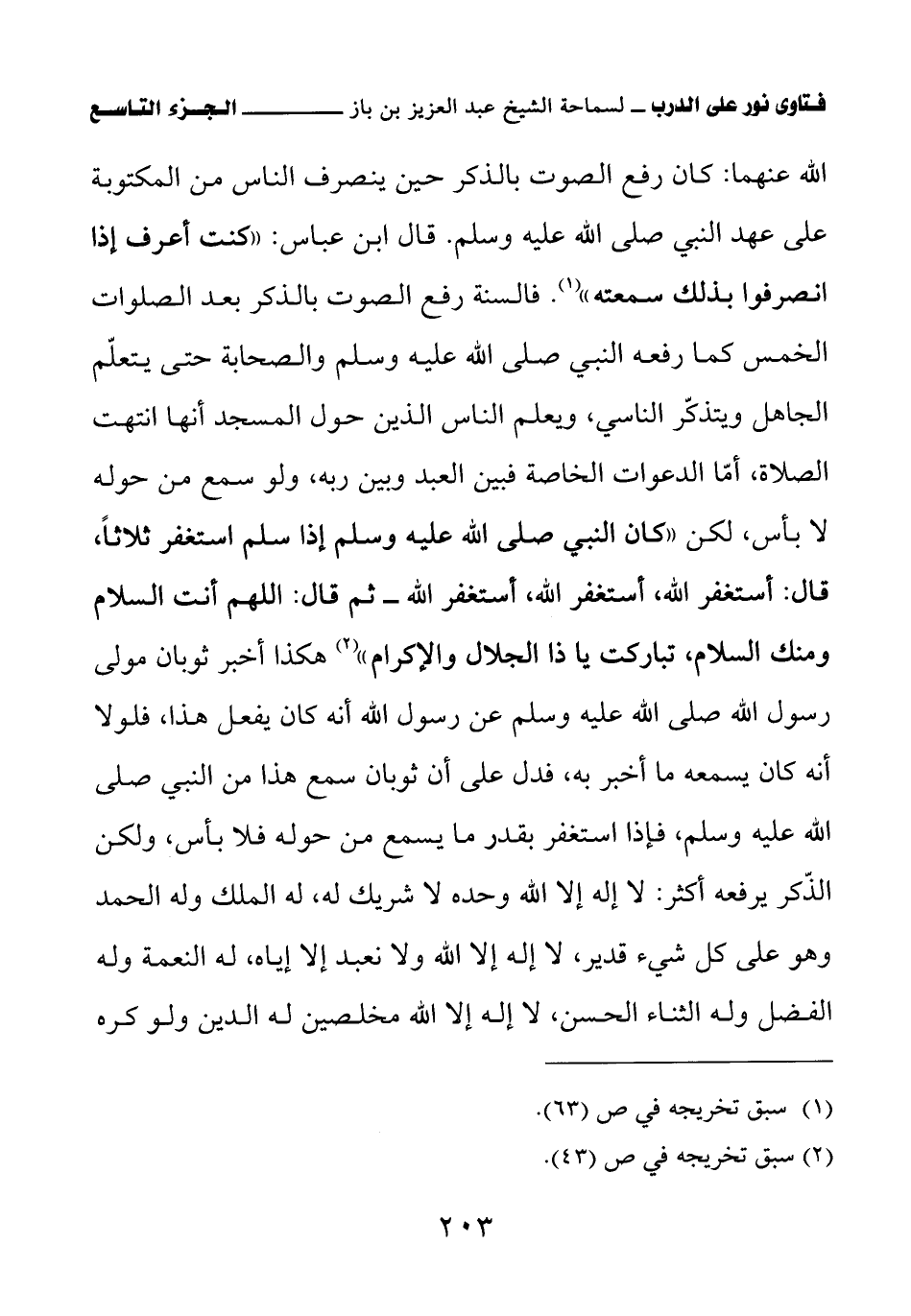 الله عنهما: كان رفع الصوت بالذكر حين ينصرف الناس من المكتوبة على عهد النبي صلى الله عليه وسلم. قال ابن عباس: " «كنت أعرف إذا انصرفوا بذلك سمعته (¬1)» فالسنة رفع الصوت بالذكر بعد الصلوات الخمس كما رفعه النبي صلى الله عليه وسلم والصحابة؛ حتى يتعلم الجاهل ويتذكر الناسي، ويعلم الناس الذين حول المسجد أنها انتهت الصلاة، أما الدعوات الخاصة فبين العبد وبين ربه، ولو سمع من حوله لا بأس، لكن " «كان النبي صلى الله عليه وسلم إذا سلم استغفر ثلاثا؛ قال: أستغفر الله، أستغفر الله، أستغفر الله – ثم قال: اللهم أنت السلام ومنك السلام، تباركت يا ذا الجلال والإكرام (¬2)» هكذا أخبر ثوبان مولى رسول الله صلى الله عليه وسلم عن رسول الله أنه كان يفعل هذا، فلولا أنه كان يسمعه ما أخبر به، فدل على أن ثوبان سمع هذا من النبي صلى الله عليه وسلم، فإذا استغفر بقدر ما يسمع من حوله فلا بأس، ولكن الذكر يرفعه أكثر: لا إله إلا الله وحده لا شريك له، له الملك وله الحمد وهو على كل شيء قدير، لا إله إلا الله ولا نعبد إلا إياه، له النعمة وله الفضل وله الثناء الحسن، لا إله إلا الله مخلصين له الدين ولو كره