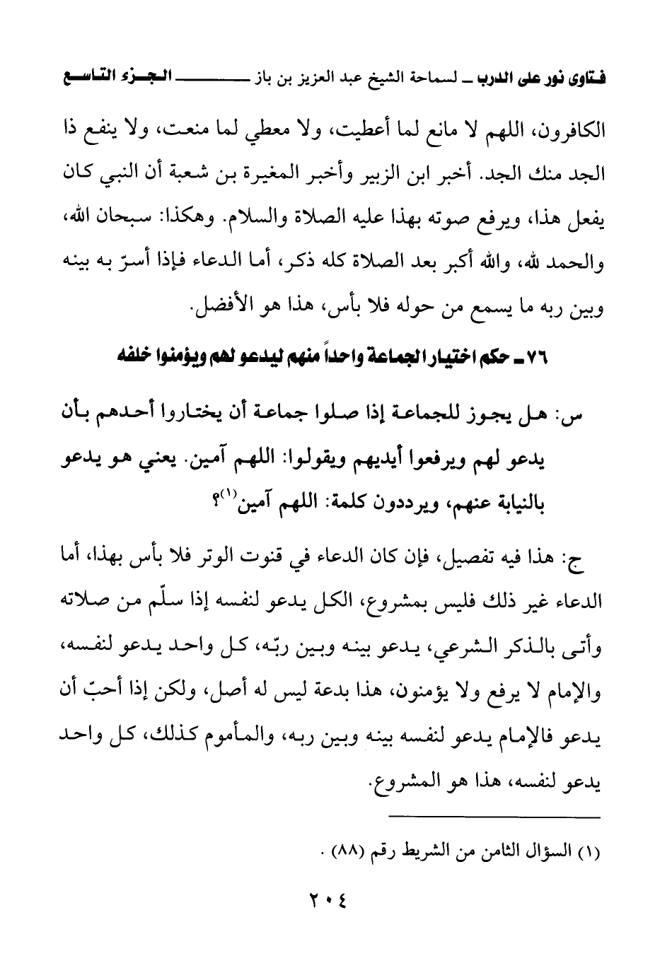 76 - حكم اختيار الجماعة واحدا منهم ليدعو لهم ويؤمنوا خلفه