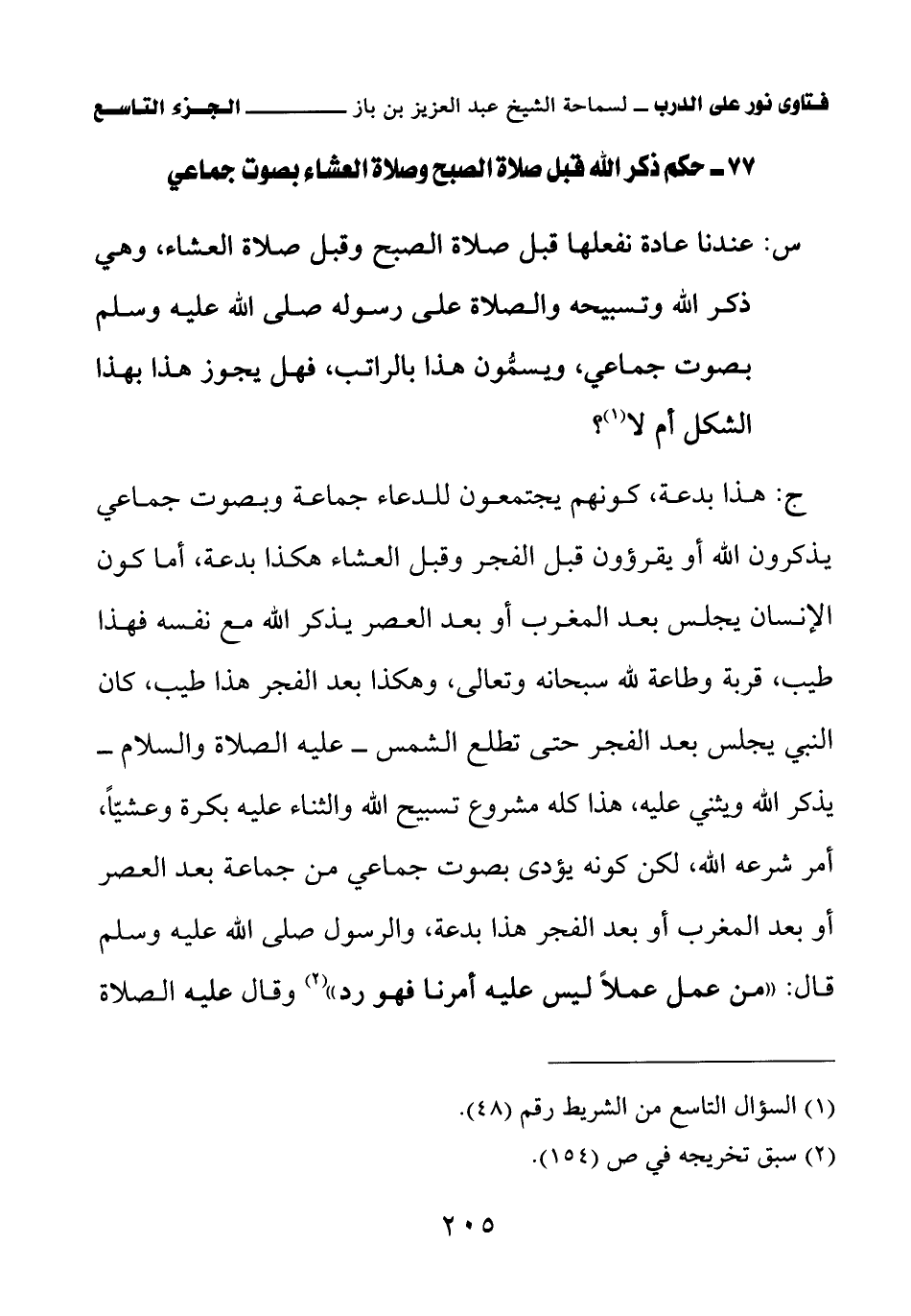 ج: هذا بدعة، كونهم يجتمعون للدعاء جماعة وبصوت جماعي يذكرون الله أو يقرؤون قبل الفجر وقبل العشاء هكذا بدعة، أما كون الإنسان يجلس بعد المغرب أو بعد العصر يذكر الله مع نفسه فهذا طيب، قربة وطاعة لله سبحانه وتعالى، وهكذا بعد الفجر هذا طيب، كان النبي يجلس بعد الفجر حتى تطلع الشمس – عليه الصلاة والسلام – يذكر الله ويثني عليه، هذا كله مشروع تسبيح الله والثناء عليه بكرة وعشيا، أمر شرعه الله، لكن كونه يؤدي بصوت جماعي من جماعة بعد العصر أو بعد المغرب أو بعد الفجر هذا بدعة، والرسول صلى الله عليه وسلم قال: «من عمل عملا ليس عليه أمرنا فهو رد (¬2)» وقال عليه الصلاة