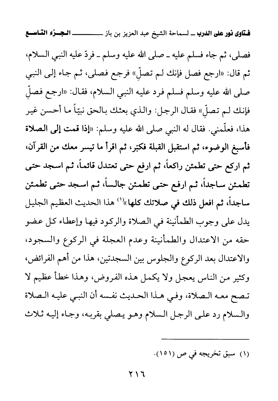 فصلى، ثم جاء فسلم عليه – صلى الله عليه وسلم – فرد عليه النبي السلام، ثم قال: ارجع فصل؛ فإنك لم تصل فرجع فصلى، ثم جاء إلى النبي صلى الله عليه وسلم فسلم فرد عليه النبي السلام، فقال: ارجع فصل؛ فإنك لم تصل فقال الرجل: والذي بعثك بالحق نبيا، ما أحسن غير هذا، فعلمني. فقال له النبي صلى الله عليه وسلم: إذا قمت إلى الصلاة فأسبغ الوضوء، ثم استقبل القبلة فكبر، ثم اقرأ ما تيسر معك من القرآن، ثم اركع حتى تطمئن راكعا، ثم ارفع حتى تعتدل قائما، ثم اسجد حتى تطمئن ساجدا، ثم ارفع حتى تطمئن جالسا، ثم اسجد حتى تطمئن ساجدا، ثم افعل ذلك في صلاتك كلها (¬1)» هذا الحديث العظيم الجليل يدل على وجوب الطمأنينة في الصلاة والركود فيها وإعطاء كل عضو حقه من الاعتدال والطمأنينة وعدم العجلة في الركوع والسجود، والاعتدال بعد الركوع والجلوس بين السجدتين، هذا من أهم الفرائض. وكثير من الناس يعجل ولا يكمل هذه الفروض، وهذا خطأ عظيم لا تصح معه الصلاة، وفي هذا الحديث نفسه أن النبي عليه الصلاة والسلام رد على الرجل السلام وهو يصلي بقربه، وجاء إليه ثلاث