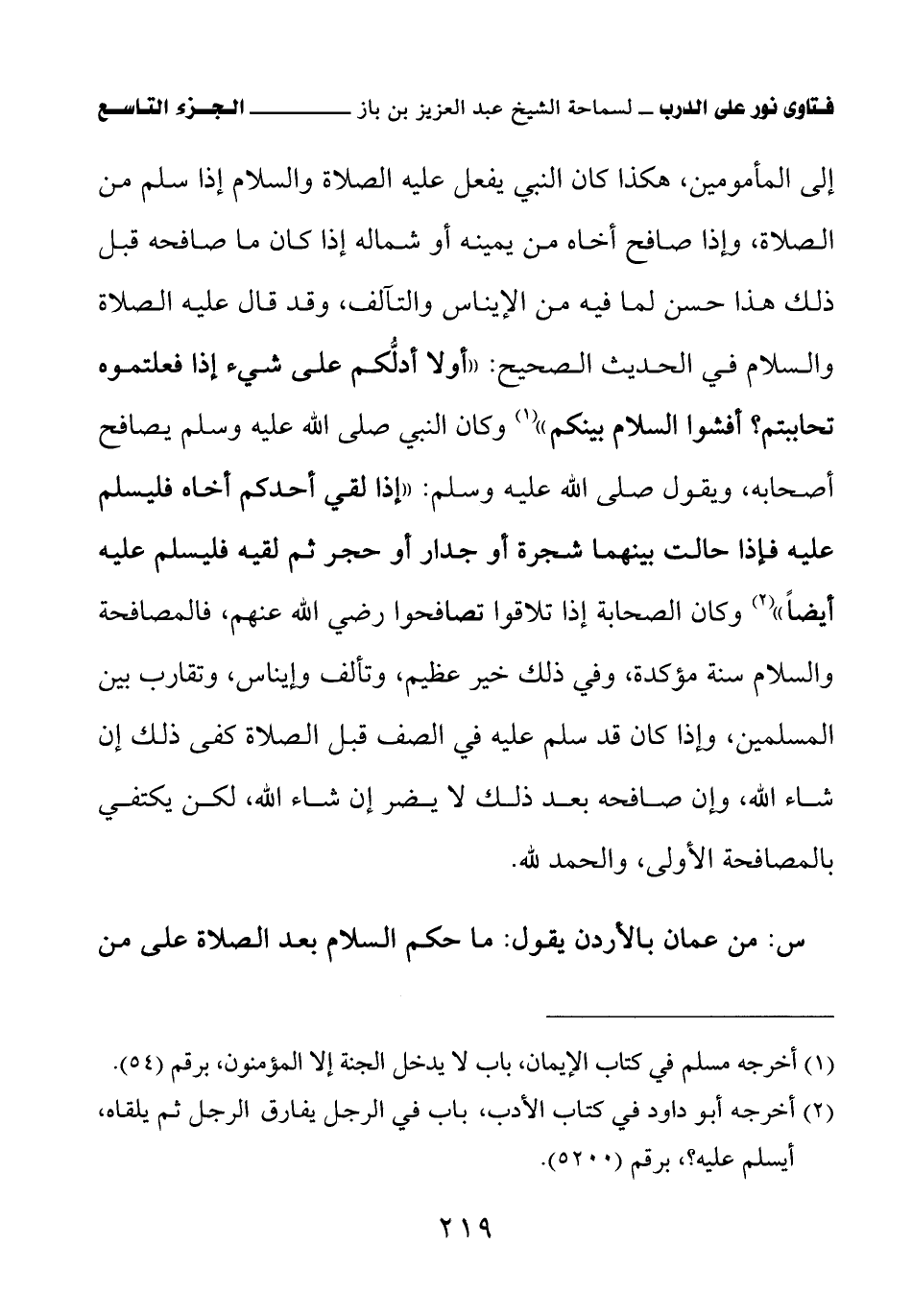إلى المأمومين، هكذا كان النبي يفعل عليه الصلاة والسلام إذا سلم من الصلاة، وإذا صافح أخاه من يمينه أو شماله إذا كان ما صافحه قبل ذلك، هذا حسن؛ لما فيه من الإيناس والتآلف، وقد قال عليه الصلاة والسلام في الحديث الصحيح: «أولا أدلكم على شيء إذا فعلتموه تحاببتم؟ أفشوا السلام بينكم (¬1)» وكان النبي صلى الله عليه وسلم يصافح أصحابه، ويقول صلى الله عليه وسلم: «إذا لقي أحدكم أخاه فليسلم عليه، فإذا حالت بينهما شجرة أو جدار أو حجر، ثم لقيه فليسلم عليه أيضا (¬2)» وكان الصحابة إذا تلاقوا تصافحوا رضي الله عنهم، فالمصافحة والسلام سنة مؤكدة، وفي ذلك خير عظيم، وتألف وإيناس، وتقارب بين المسلمين، وإذا كان قد سلم عليه في الصف قبل الصلاة كفى ذلك إن شاء الله، وإن صافحه بعد ذلك لا يضر إن شاء الله، لكن يكتفي بالمصافحة الأولى، والحمد لله.