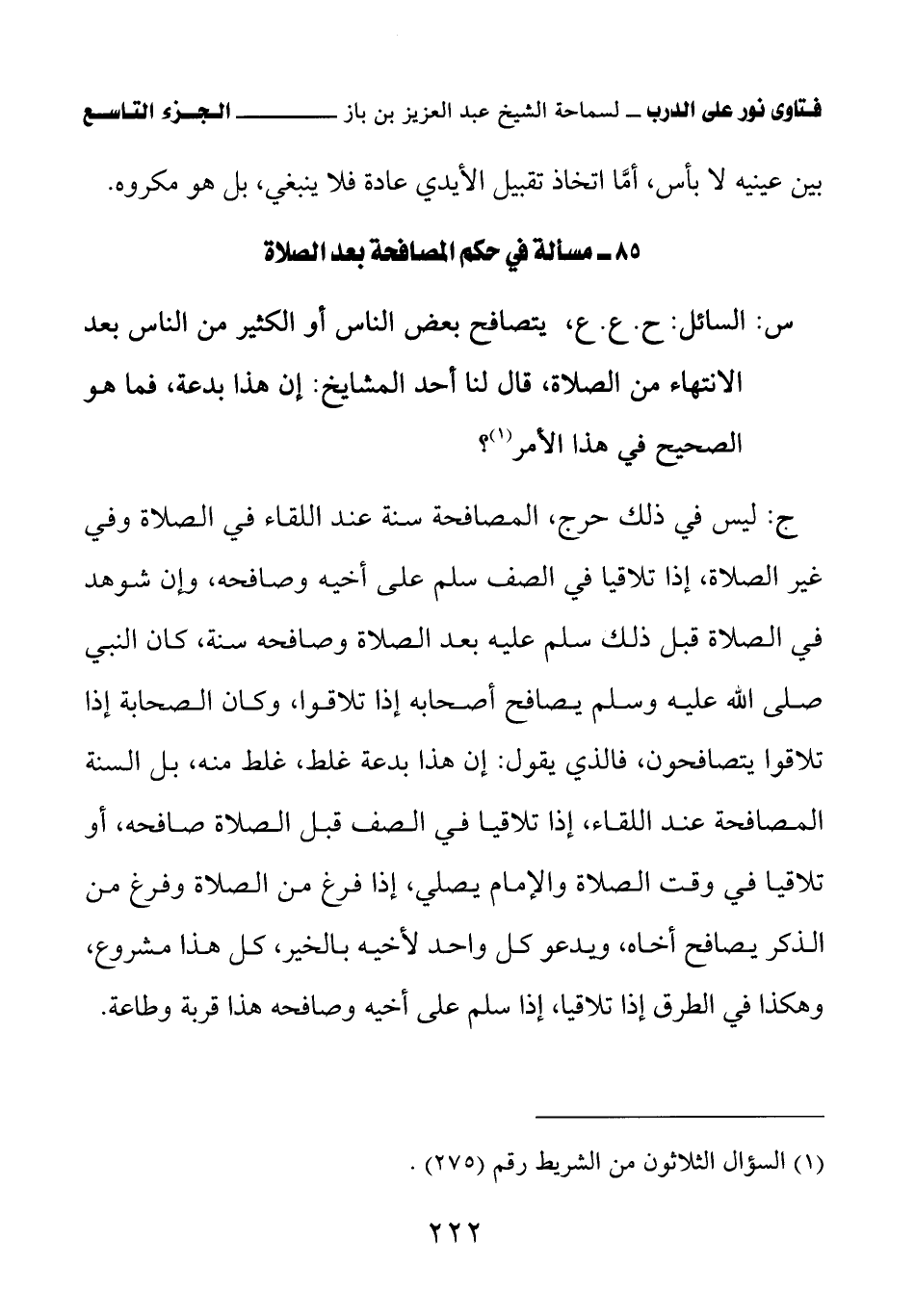 س: السائل: ح. ع. ع، يتصافح بعض الناس أو الكثير من الناس بعد الانتهاء من الصلاة، قال لنا أحد المشايخ: إن هذا بدعة، فما هو الصحيح في هذا الأمر (¬1)؟
