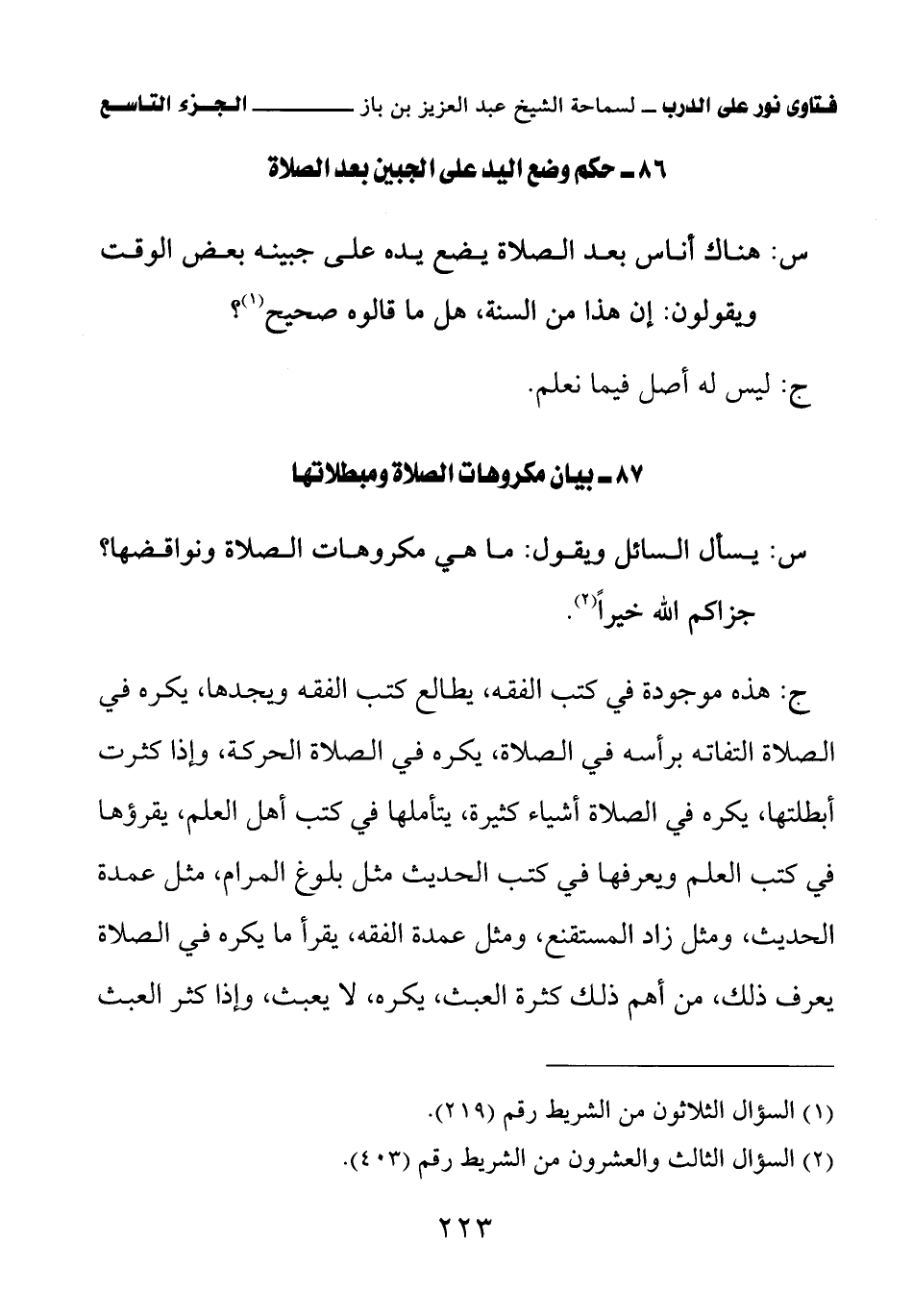 ج: هذه موجودة في كتب الفقه، يطالع كتب الفقه ويجدها؛ يكره في الصلاة التفاته برأسه في الصلاة، يكره في الصلاة الحركة، وإذا كثرت أبطلتها، يكره في الصلاة أشياء كثيرة، يتأملها في كتب أهل العلم، يقرؤها في كتب العلم، ويعرفها في كتب الحديث مثل بلوغ المرام مثل عمدة الحديث، ومثل زاد المستقنع، ومثل عمدة الفقه، يقرأ ما يكره في الصلاة يعرف ذلك، من أهم ذلك كثرة العبث، يكره، لا يعبث، وإذا كثر العبث