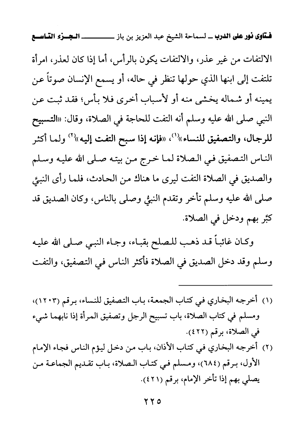الالتفات من غير عذر، والالتفات يكون بالرأس، أما إذا كان لعذر، امرأة تلتفت إلى ابنها الذي حولها تنظر في حاله، أو يسمع الإنسان صوتا عن يمينه أو شماله يخشى منه أو لأسباب أخرى فلا بأس؛ فقد ثبت عن النبي صلى الله عليه وسلم أنه التفت للحاجة في الصلاة, وقال: «التسبيح للرجال والتصفيق للنساء (¬1)» «فإنه إذا سبح التفت إليه (¬2)» ولما أكثر الناس التصفيق في الصلاة لما خرج من بيته صلى الله عليه وسلم والصديق في الصلاة التفت ليرى ما هناك من الحادث، فلما رأى النبي صلى الله عليه وسلم تأخر وتقدم النبي وصلى بالناس، وكان الصديق قد كبر بهم ودخل في الصلاة.