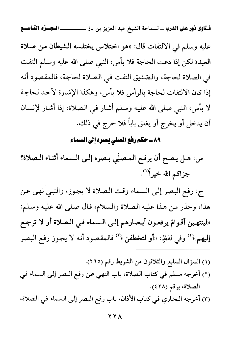 ج: رفع البصر إلى السماء وقت الصلاة لا يجوز، والنبي نهى عن هذا، وحذر من هذا عليه الصلاة والسلام، قال صلى الله عليه وسلم: «لينتهين أقوام يرفعون أبصارهم إلى السماء في الصلاة، أو لا ترجع إليهم (¬2)» وفي لفظ: «أو لتخطفن (¬3)» فالمقصود أنه لا يجوز رفع البصر