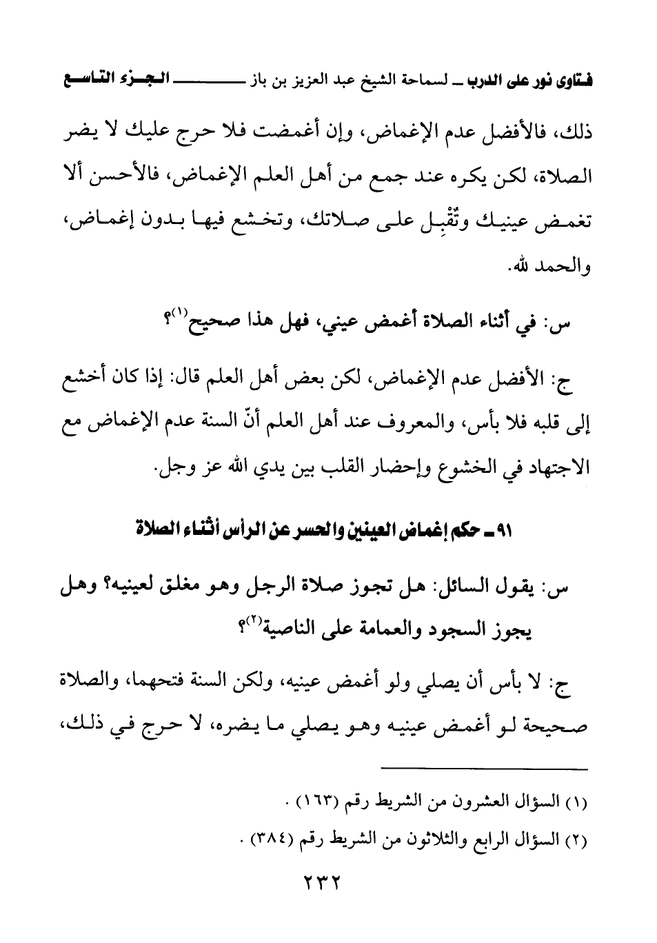 91. حكم إغماض العينين والحسر عن الرأس أثناء الصلاة