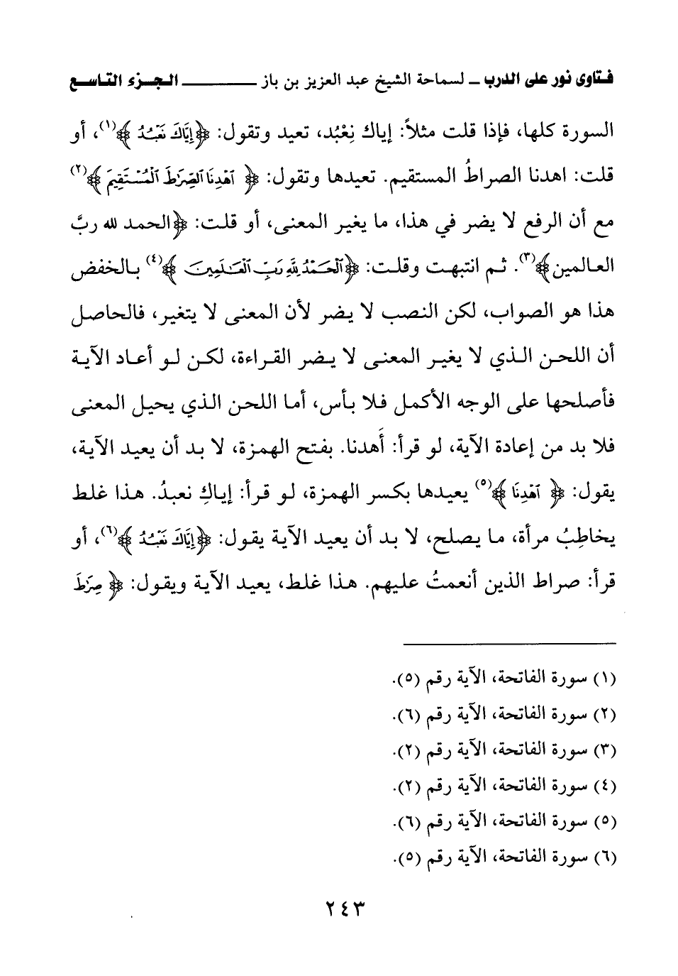 السورة كلها، فإذا قلت مثلا: إياك نعبد، تعيد وتقول: {إِيَّاكَ نَعْبُدُ} (¬1)، أو قلت: اهدنا الصراط المستقيم. تعيدها وتقول: {اهْدِنَا الصِّرَاطَ الْمُسْتَقِيمَ} (¬2) مع أن الرفع لا يضر في هذا، ما يغير المعنى، أو قلت: الحمد لله رب العالمين. ثم انتبهت وقلت: {الْحَمْدُ لِلَّهِ رَبِّ الْعَالَمِينَ} (¬3) بالخفض هذا هو الصواب، لكن النصب لا يضر لأن المعنى لا يتغير، فالحاصل أن اللحن الذي لا يغير المعنى لا يضر القراءة، لكن لو أعاد الآية فأصلحها على الوجه الأكمل فلا بأس، أما اللحن الذي يحيل المعنى فلا بد من إعادة الآية، لو قرأ: أهدنا. بفتح الهمزة، لا بد أن يعيد الآية، يقول: {اهْدِنَا} (¬4) يعيدها بكسر الهمزة، لو قرأ: إياك نعبد. هذا غلط يخاطب مرأة، ما يصلح، لا بد أن يعيد الآية يقول: {إِيَّاكَ نَعْبُدُ} (¬5)، أو قرأ: صراط الذين أنعمت عليهم. هذا غلط، يعيد الآية ويقول: