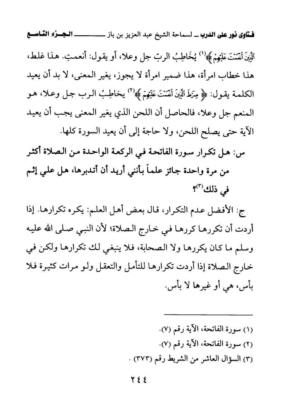 {صِرَاطَ الَّذِينَ أَنْعَمْتَ عَلَيْهِمْ} (¬1) يخاطب الرب جل وعلا، أو يقول: أنعمت. هذا غلط، هذا خطاب امرأة، هذا ضمير امرأة لا يجوز، يغير المعنى، لا بد أن يعيد الكلمة يقول: {صِرَاطَ الَّذِينَ أَنْعَمْتَ عَلَيْهِمْ} (¬2) يخاطب الرب جل وعلا، هو المنعم جل وعلا، فالحاصل أن اللحن الذي يغير المعنى يجب أن يعيد الآية حتى يصلح اللحن، ولا حاجة إلى أن يعيد السورة كلها.