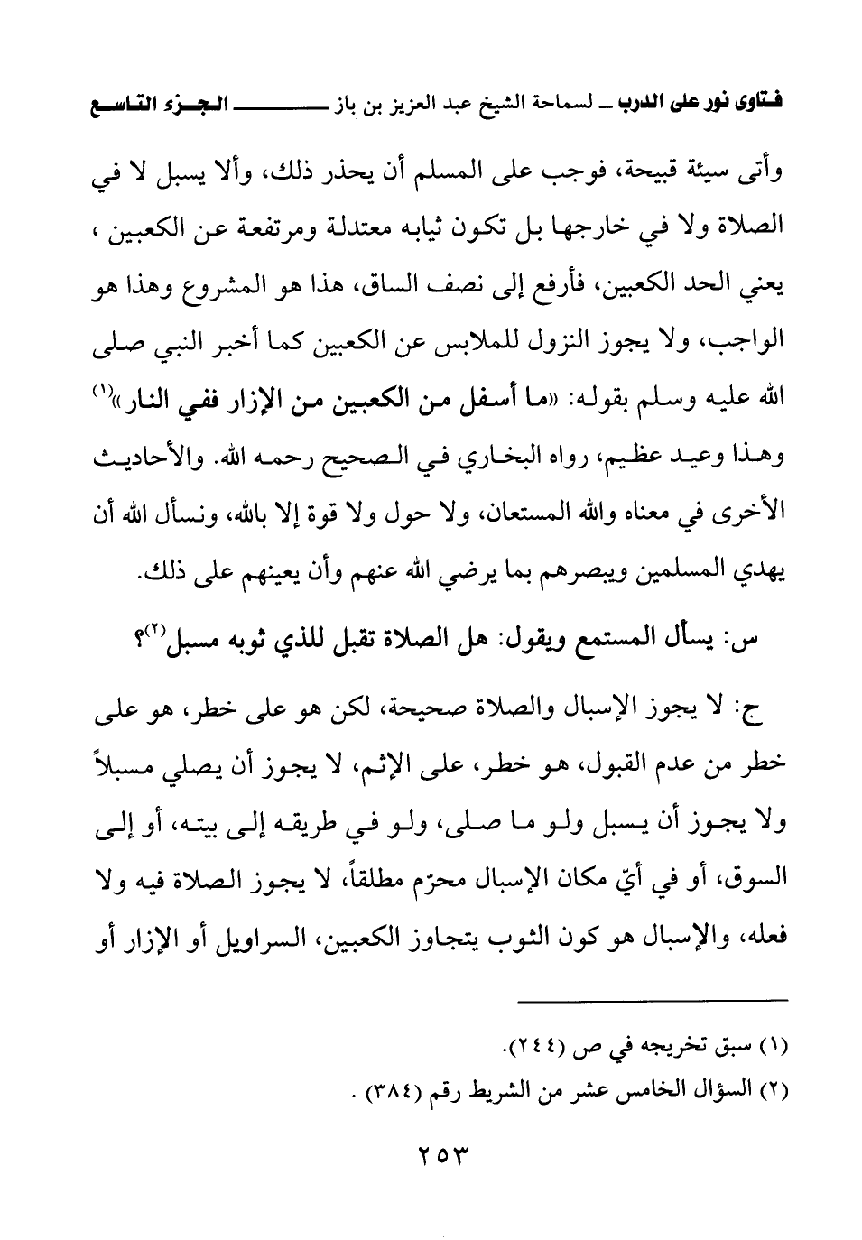 وأتى سيئة قبيحة، فوجب على المسلم أن يحذر ذلك وألا يسبل لا في الصلاة ولا في خارجها، بل تكون ثيابه معتدلة ومرتفعة عن الكعبين؛ يعني الحد الكعبين، فأرفع إلى نصف الساق، هذا هو المشروع وهذا هو الواجب، ولا يجوز النزول للملابس عن الكعبين كما أخبر النبي - صلى الله عليه وسلم - بقوله: «ما أسفل الكعبين من الإزار ففي النار (¬1)» وهذا وعيد عظيم، رواه البخاري - في الصحيح - رحمه الله، والأحاديث الأخرى في معناه، والله المستعان، ولا حول ولا قوة إلا بالله، ونسأل الله أن يهدي المسلمين ويبصرهم بما يرضي الله عنهم وأن يعينهم على ذلك.