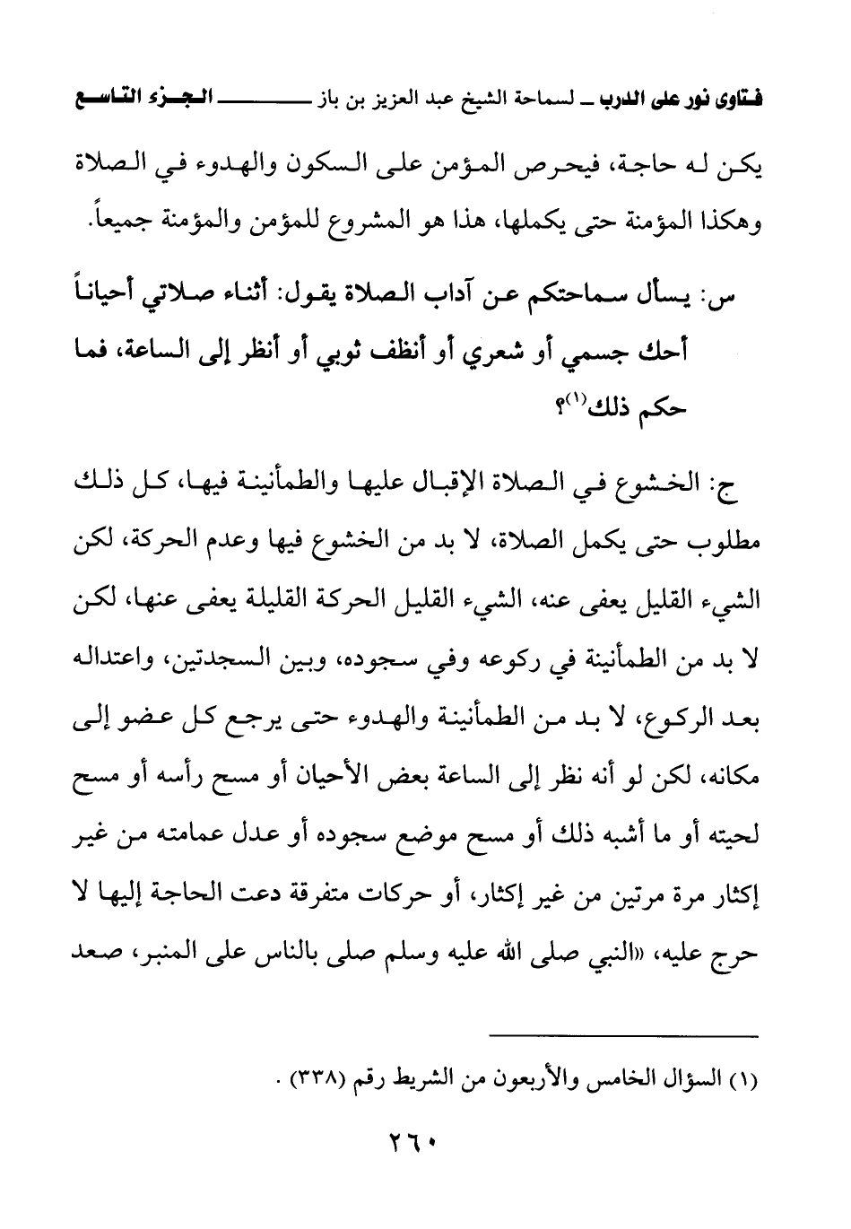 ج: الخشوع في الصلاة الإقبال عليها والطمأنينة فيها، كل ذلك مطلوب حتى يكمل الصلاة، لا بد من الخشوع فيها وعدم الحركة، لكن الشيء القليل يعفى عنه، الشيء القليل الحركة القليلة يعفى عنها، لكن لا بد من الطمأنينة في ركوعه وفي سجوده وبين السجدتين، واعتداله بعد الركوع لا بد من الطمأنينة والهدوء حتى يرجع كل عضو إلى مكانه، لكن لو أنه نظر إلى الساعة بعض الأحيان أو مسح رأسه أو مسح لحيته أو ما أشبه ذلك أو مسح موضع سجوده أو عدل عمامته من غير إكثار مرة مرتين من غير إكثار أو حركات متفرقة دعت الحاجة إليها لا حرج، النبي - صلى الله عليه وسلم - «صلى بالناس على المنبر؛ صعد
